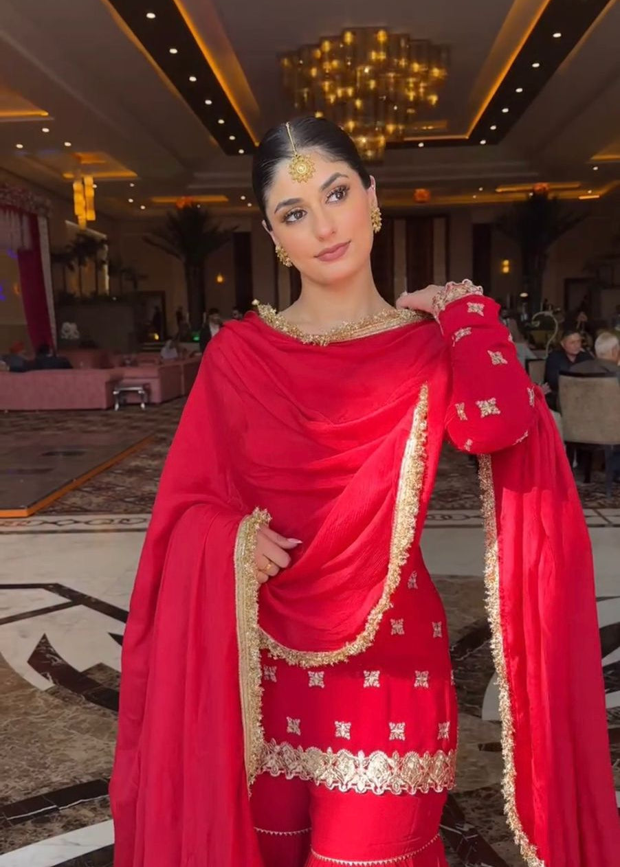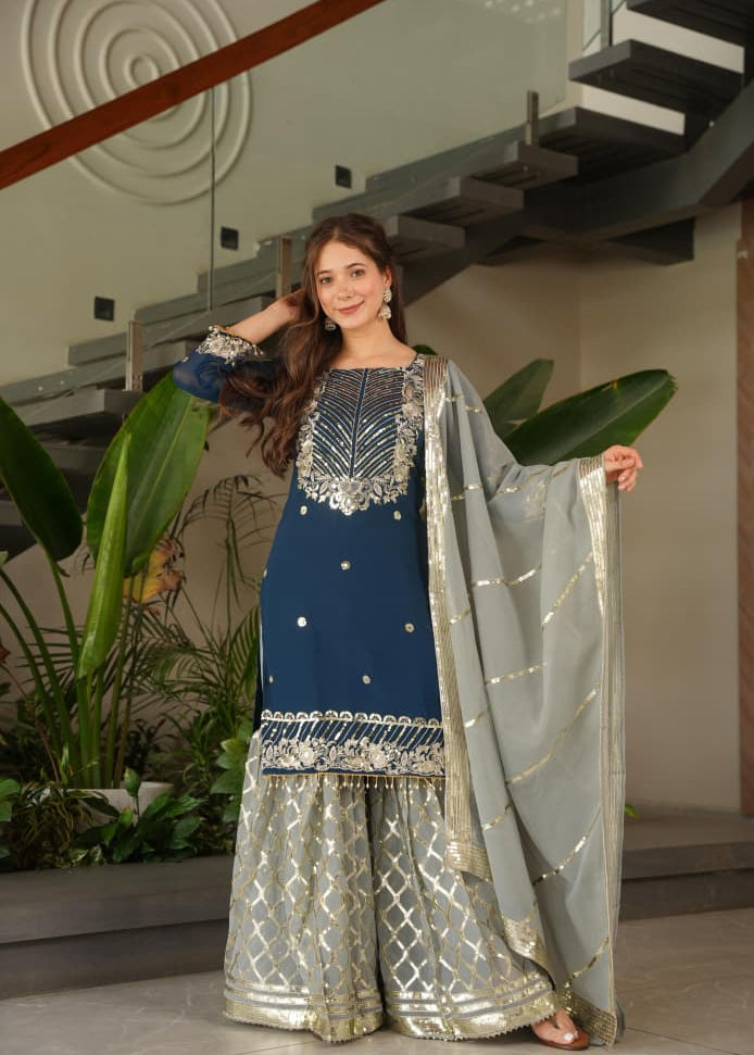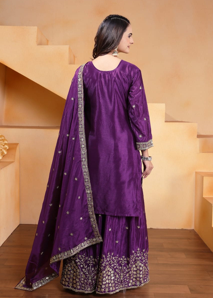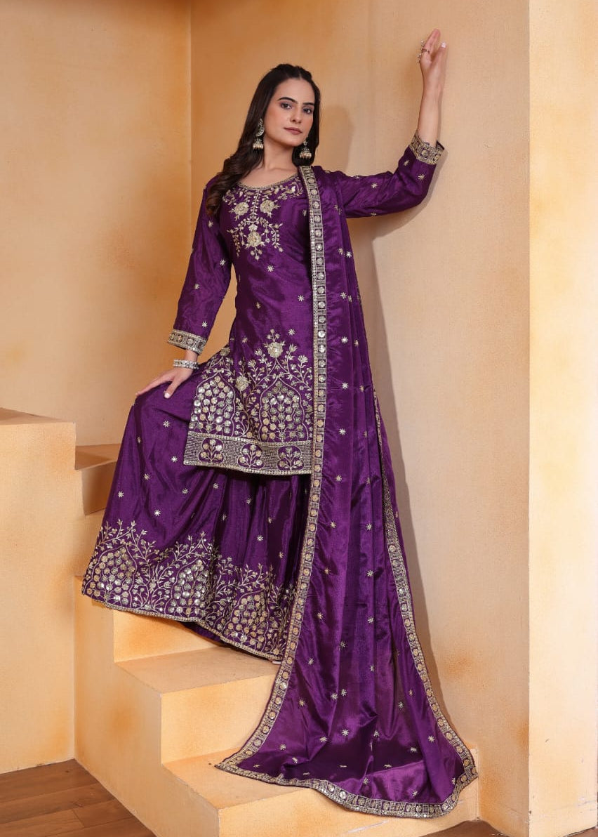 Designer Embroidered Chinon Sharara Suit