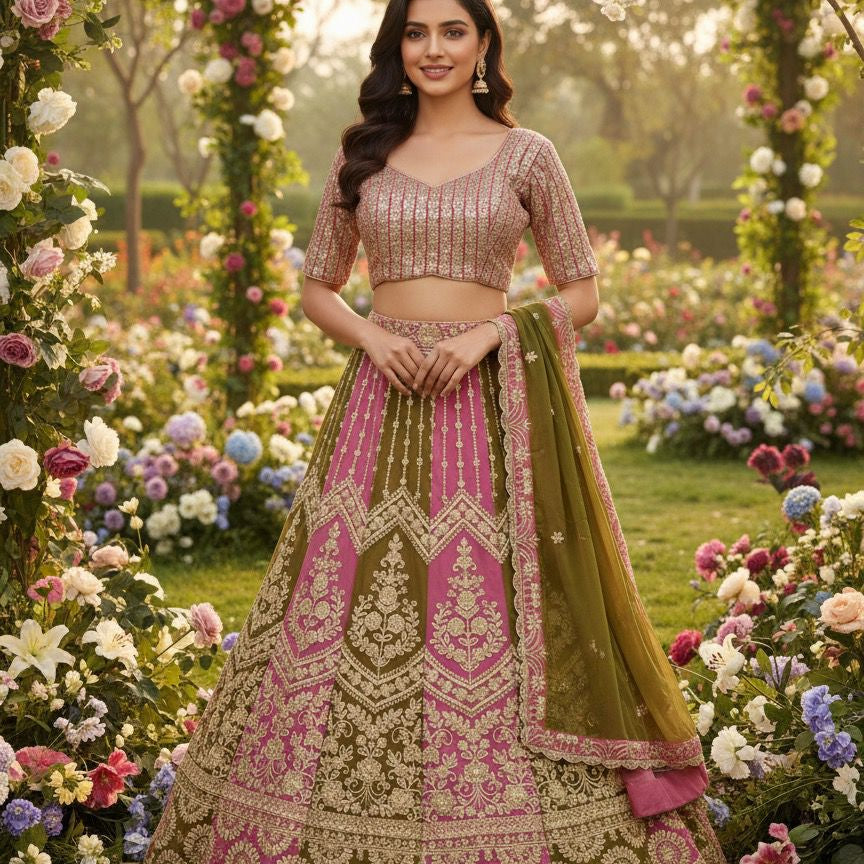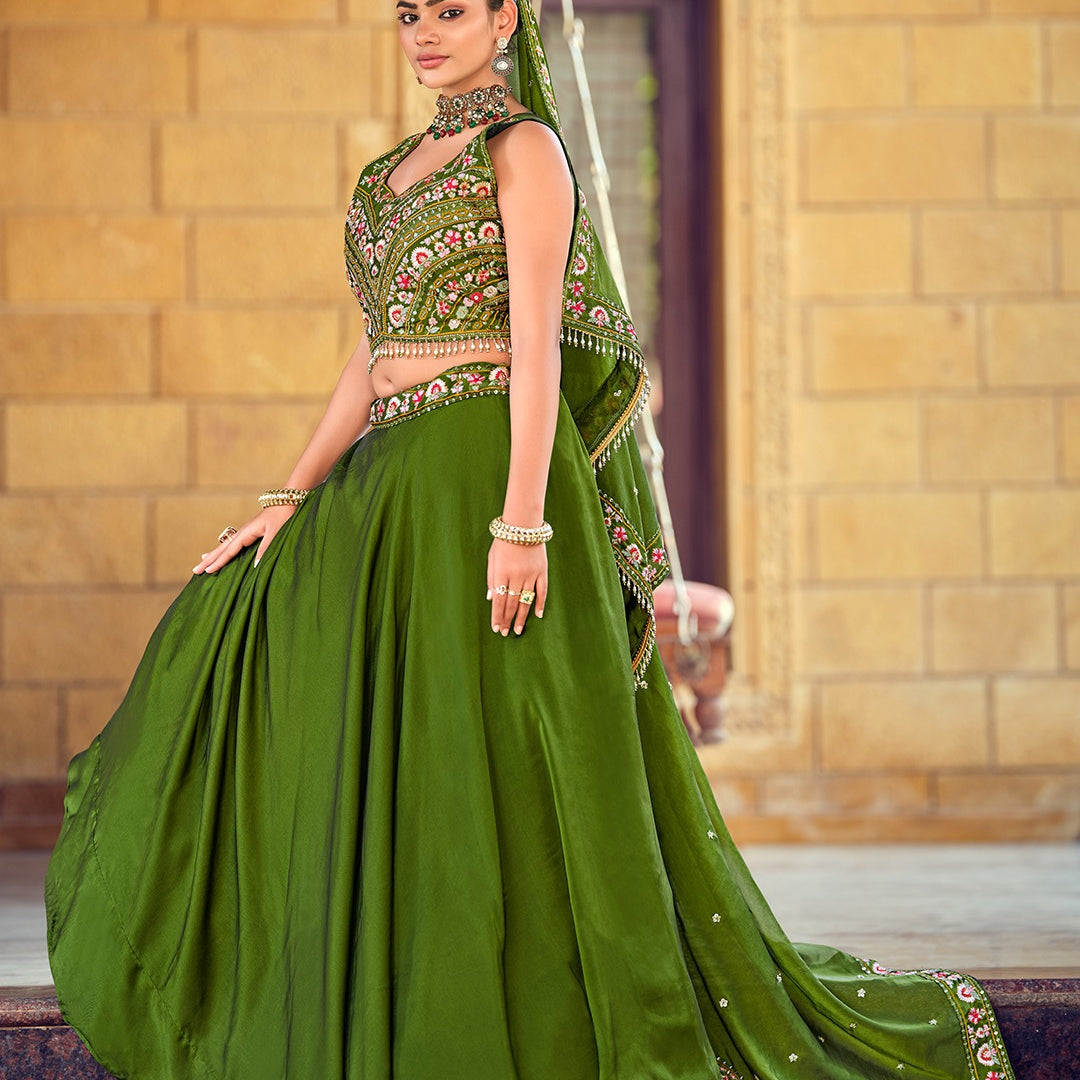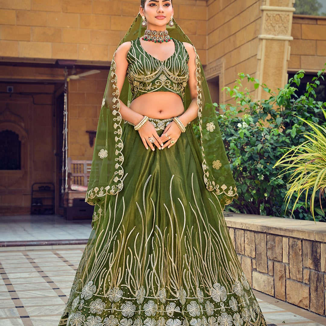 Olive Embroidered Net Lehenga