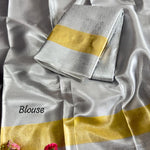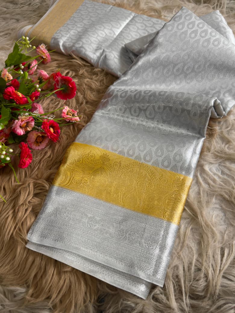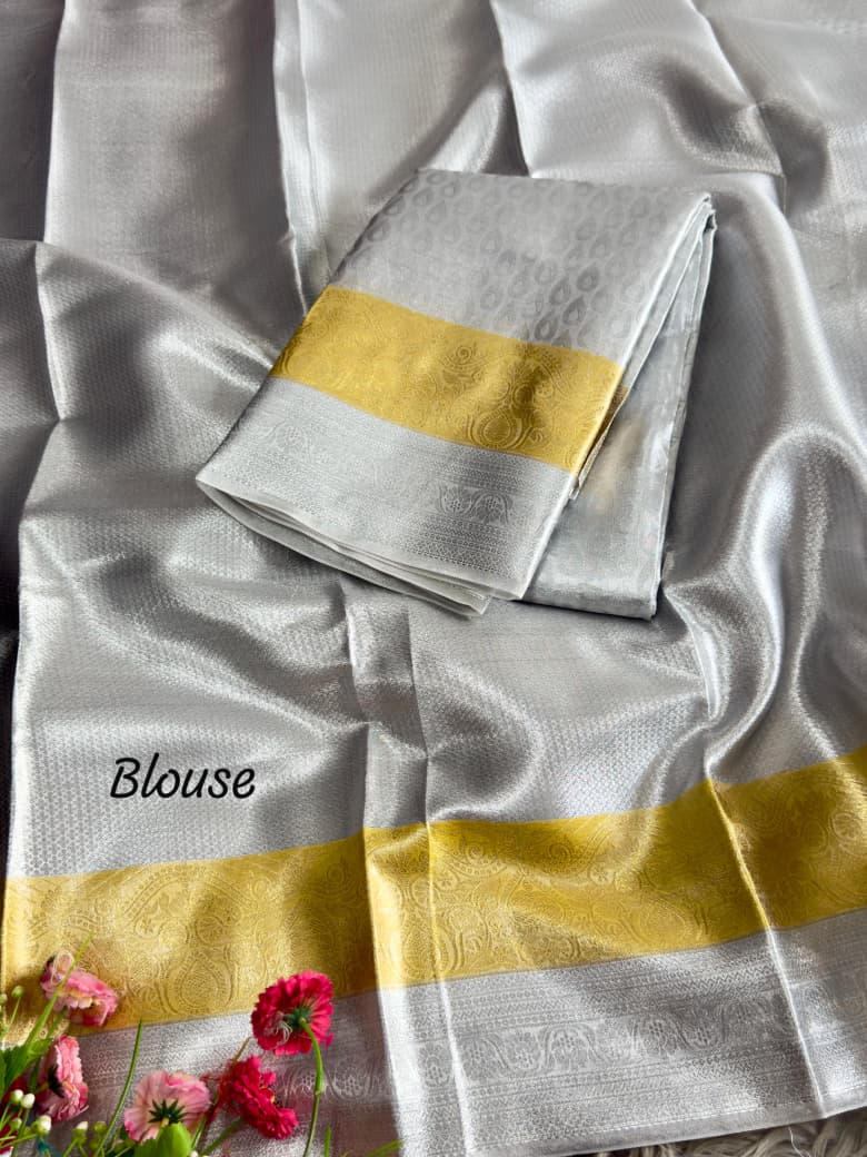 This Banarasi tissue silk saree comes with a soft silver sheen, delicate woven butti all over the body, and a rich gold zari border that adds a royal touch. Light in weight, rich in look — perfect for festive and special occasions.”
