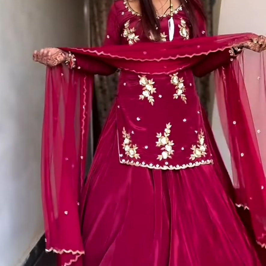 Designer Embroidered Chinon Sharara Suit