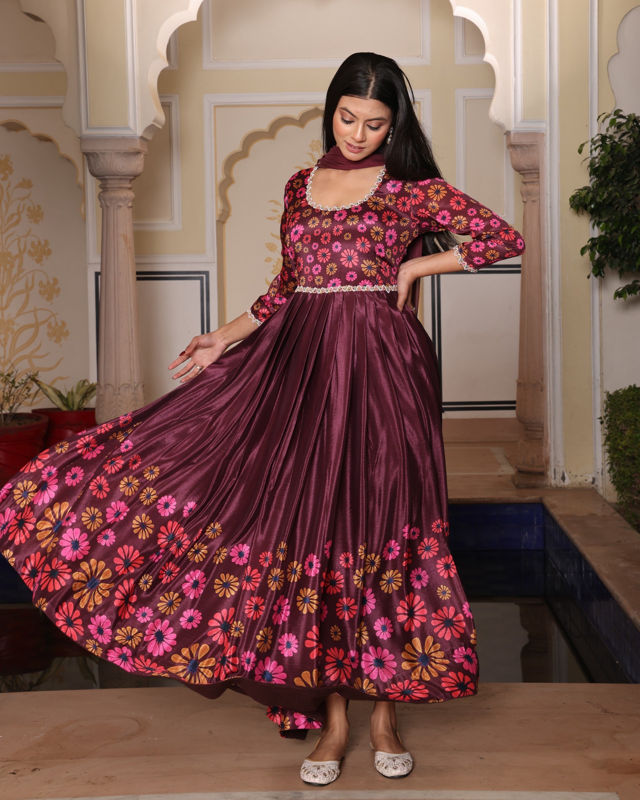 Maroon Georgette Embroidered Gown