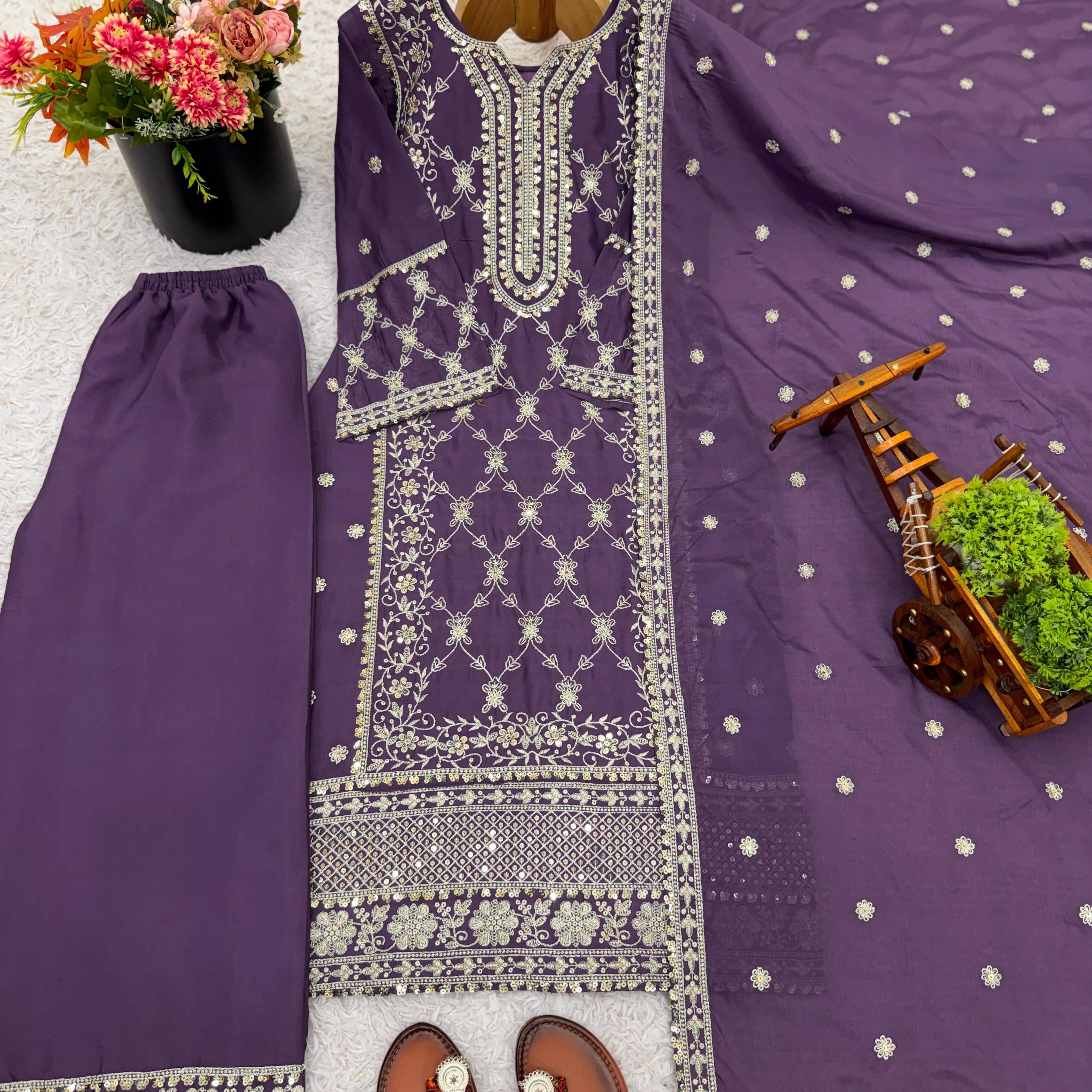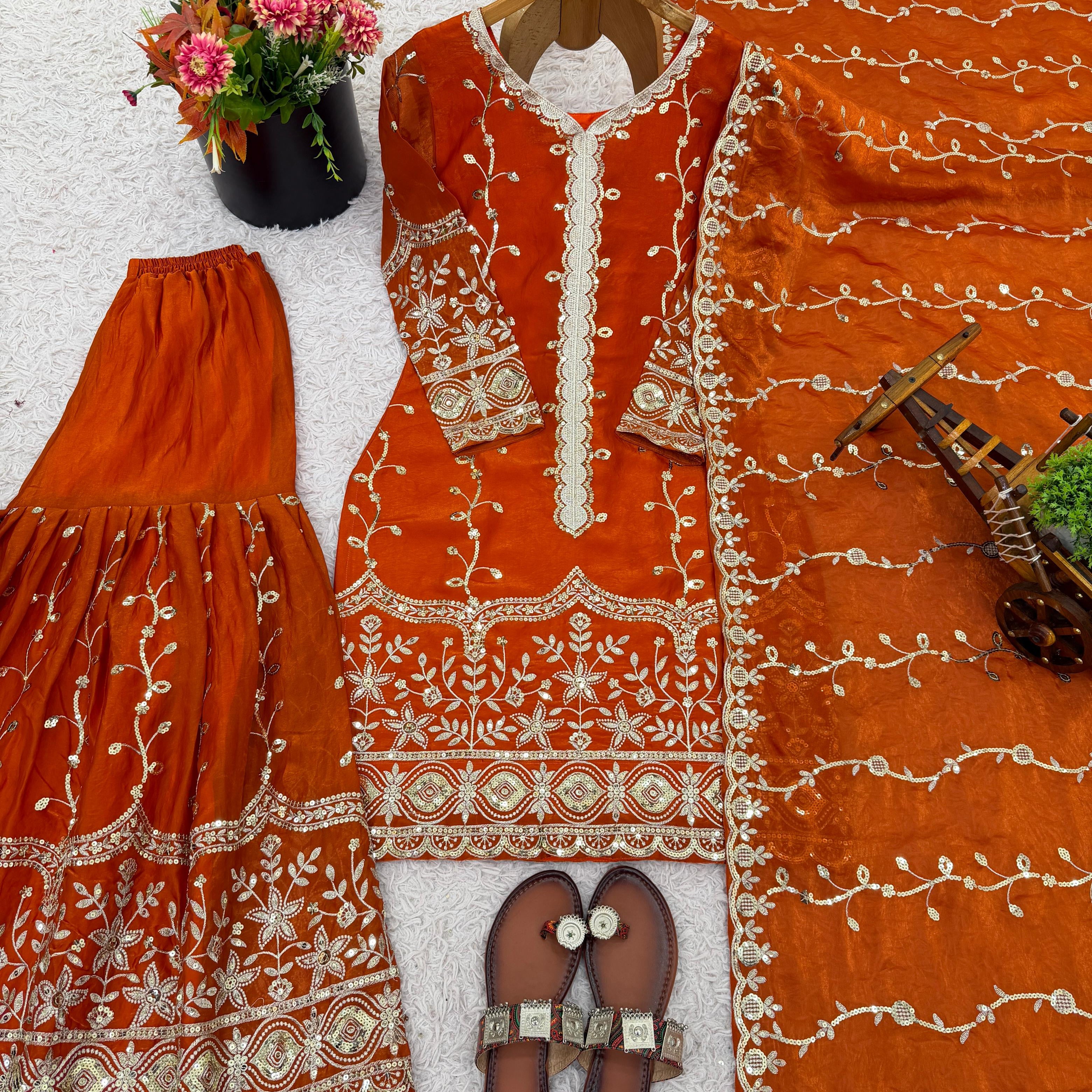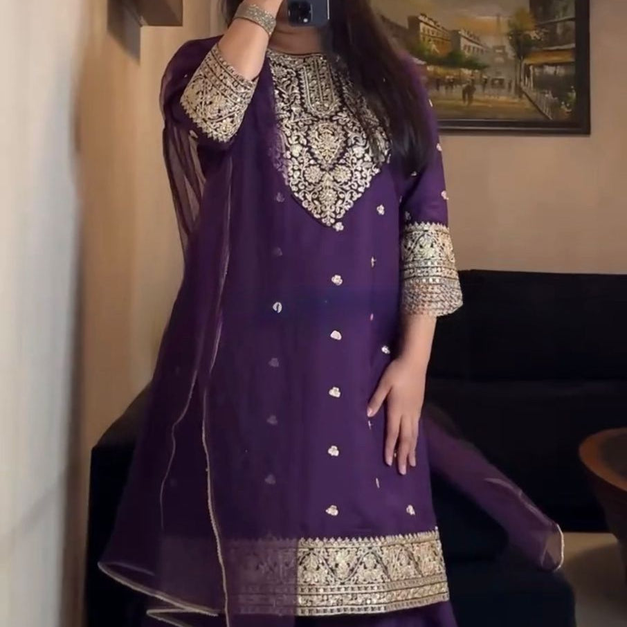 Presenting New Designer Embroidered Chinon Sharara Suit