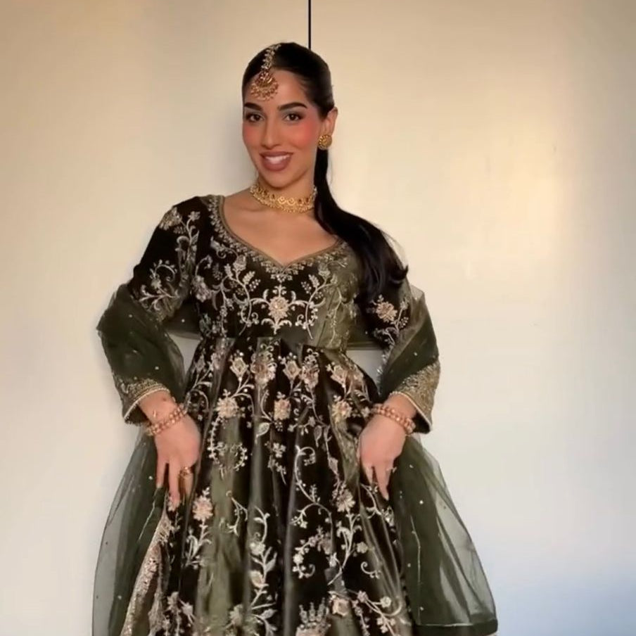 Dark Olive Velvet Embroidered Gown