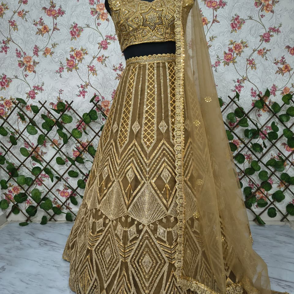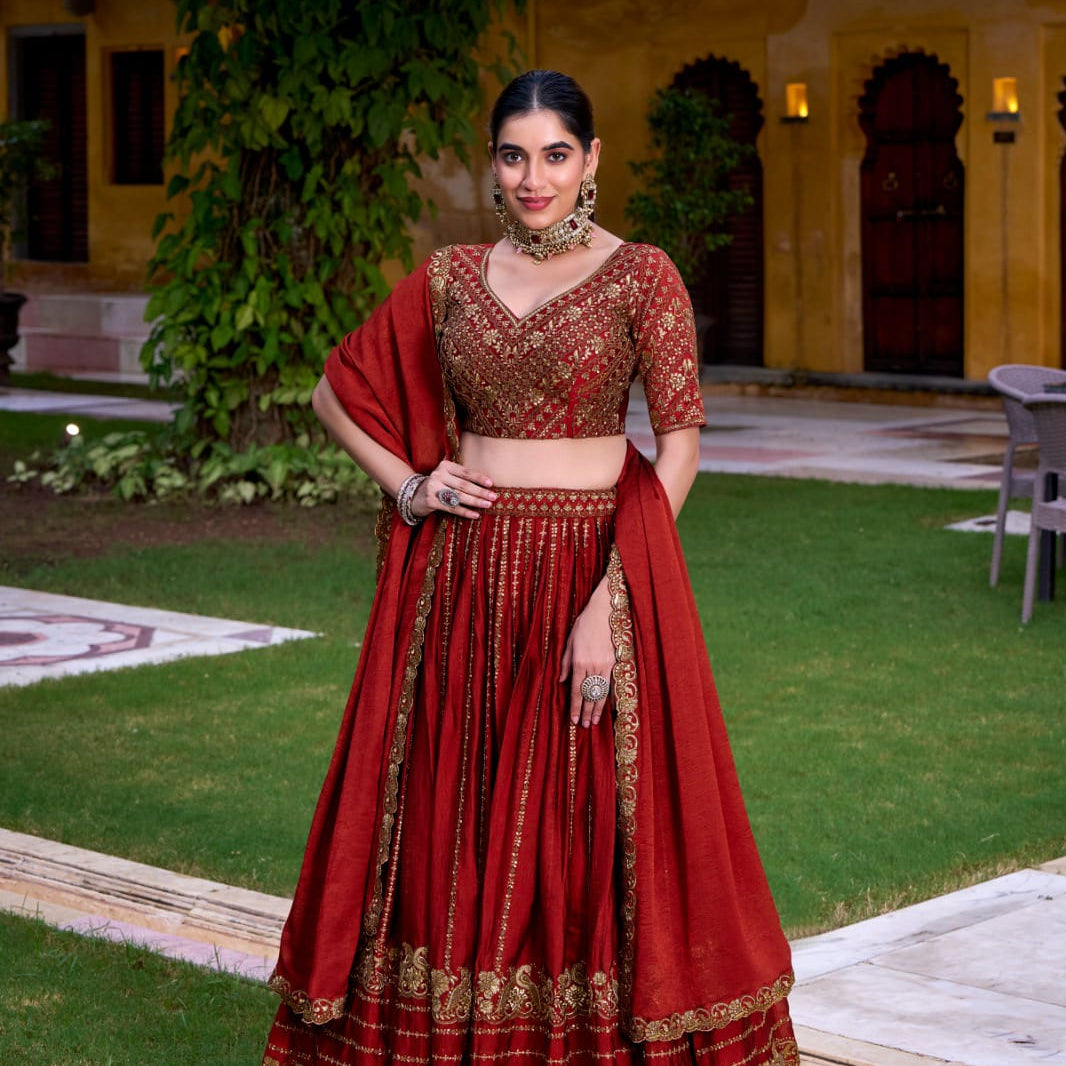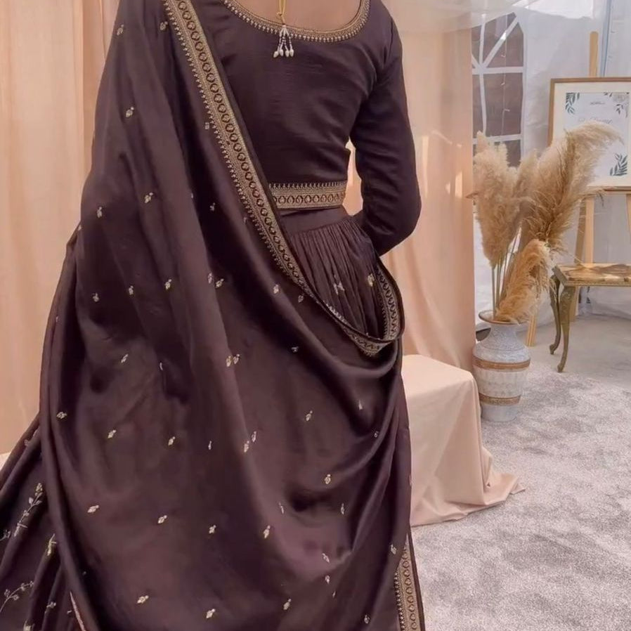 Brown Chinon Embroidered Lehenga