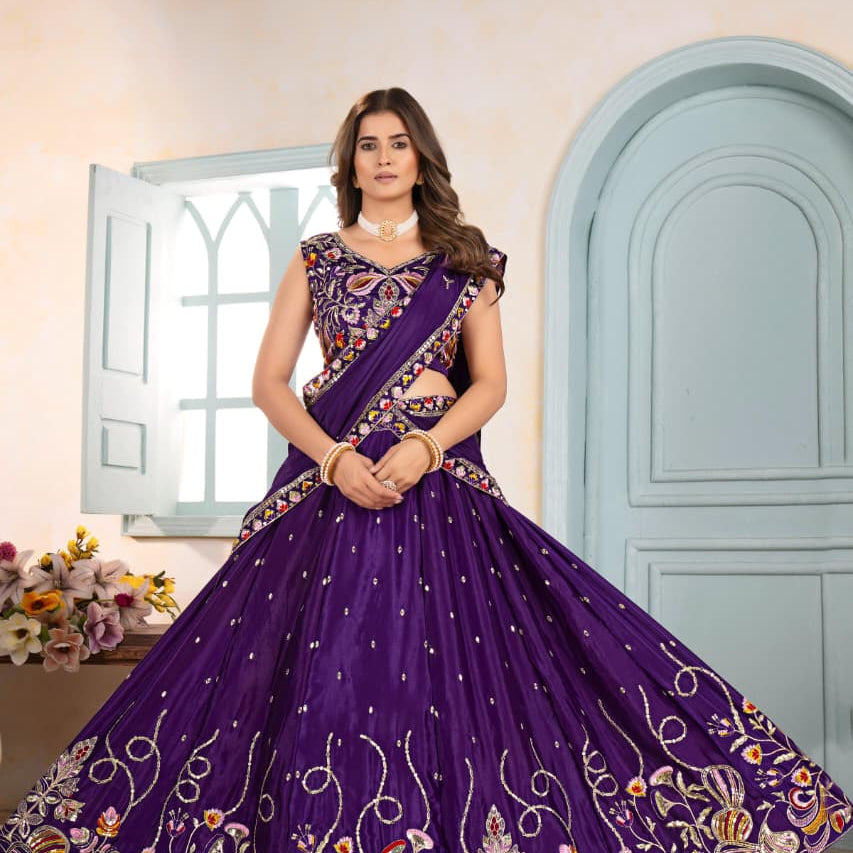 Purple Heavy Satin Embroidered Lehenga