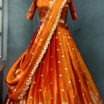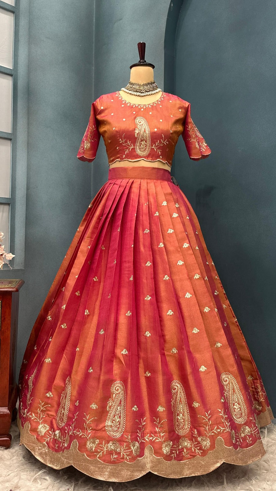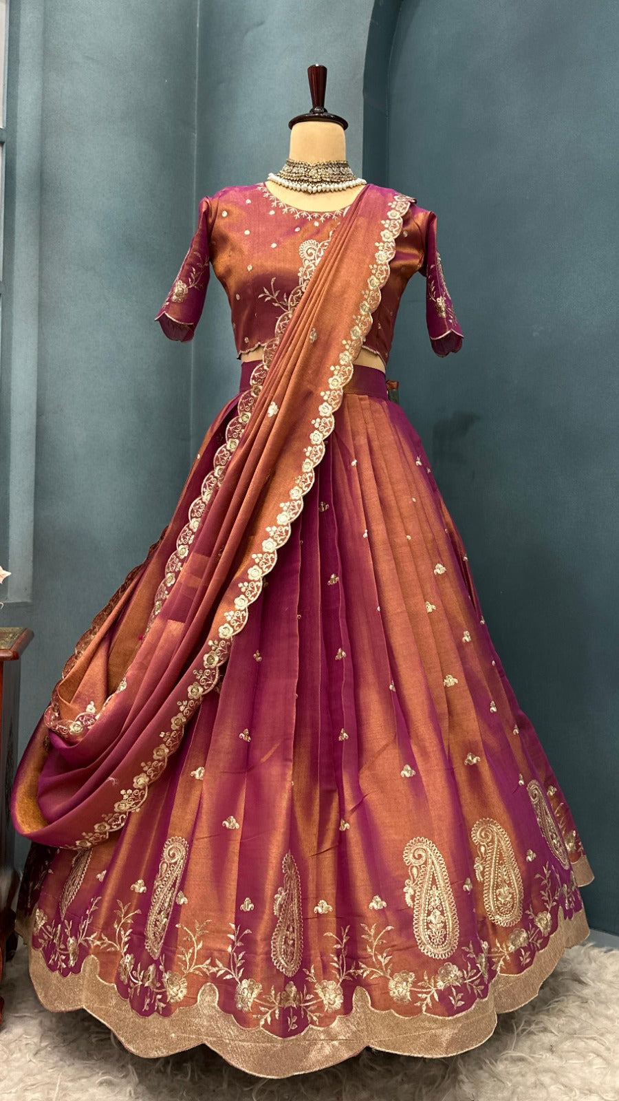 This exquisite South Tissue silk  lehenga showcases a harmonious blend of vibrant colors and luxurious fabric. The lehenga features a stunning embroidered border that elegantly frames the flowing silhouette, enhancing its overall appeal. Perfect for festive occasions or weddings, this attire combines traditional craftsmanship with contemporary style, making it a must-have addition to any wardrobe. The soft silk material ensures comfort while exuding sophistication, allowing the wearer to make a striking impression.