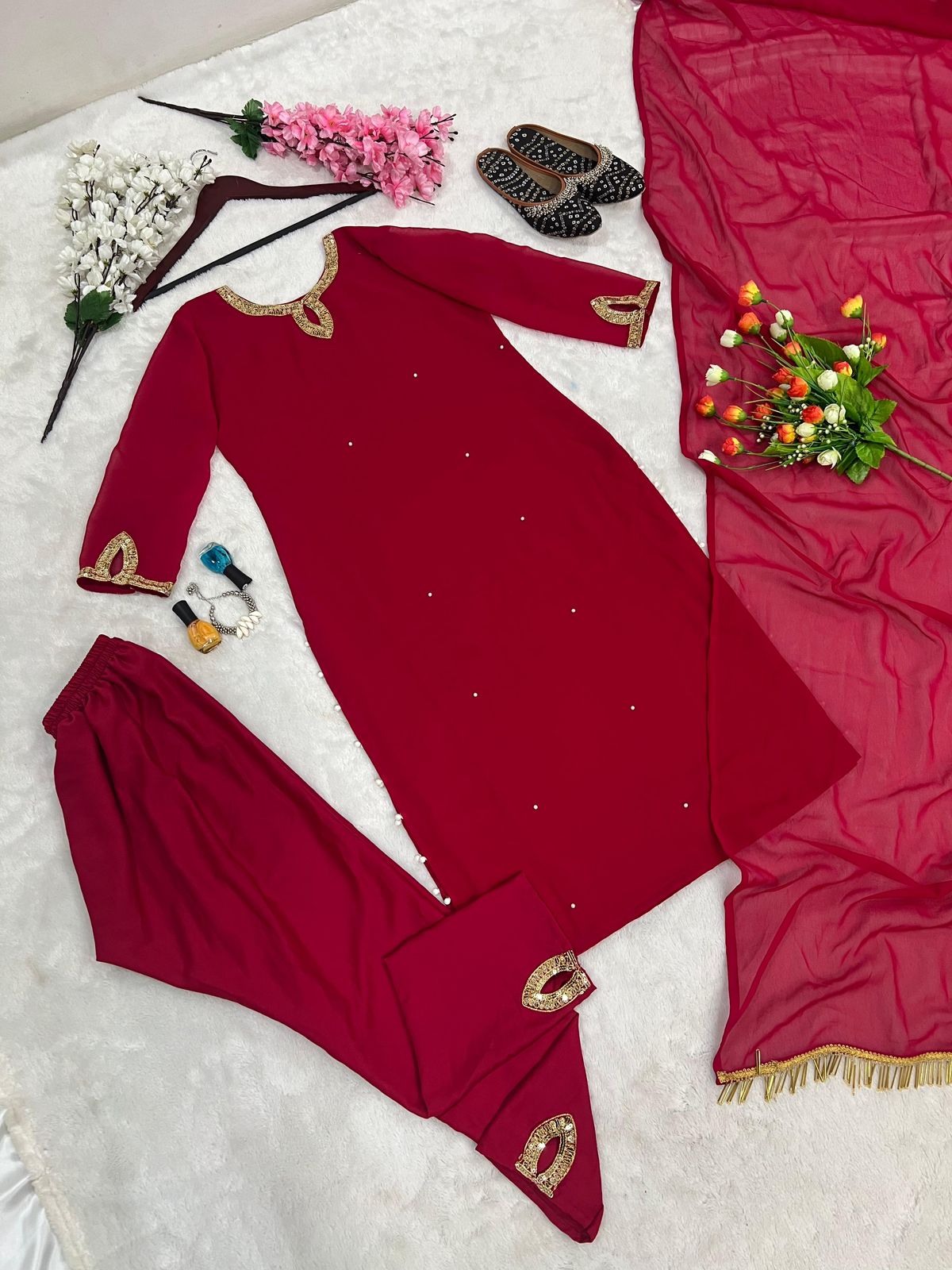 Top Fabric * :Heavy Faux Georgette With *Embroidery Sequence Work With Fancy Potli Buttons and Rivet Moti Work with Sleeve