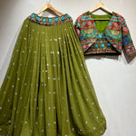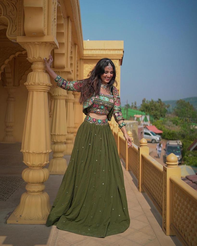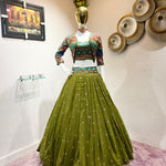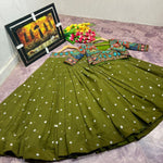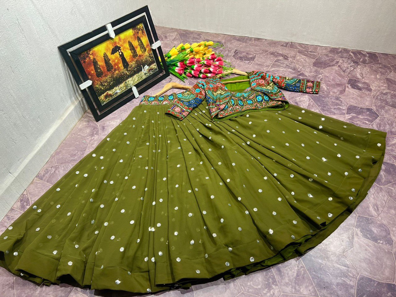 #LEHENGAS FABRIC:- FOX GORGETTE WITH SIQUNCE  EMBRODARY WORK WITH KEN-KEN AND KENVAS 6 MTR FLIR FULLY STITCHED