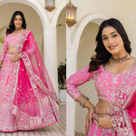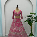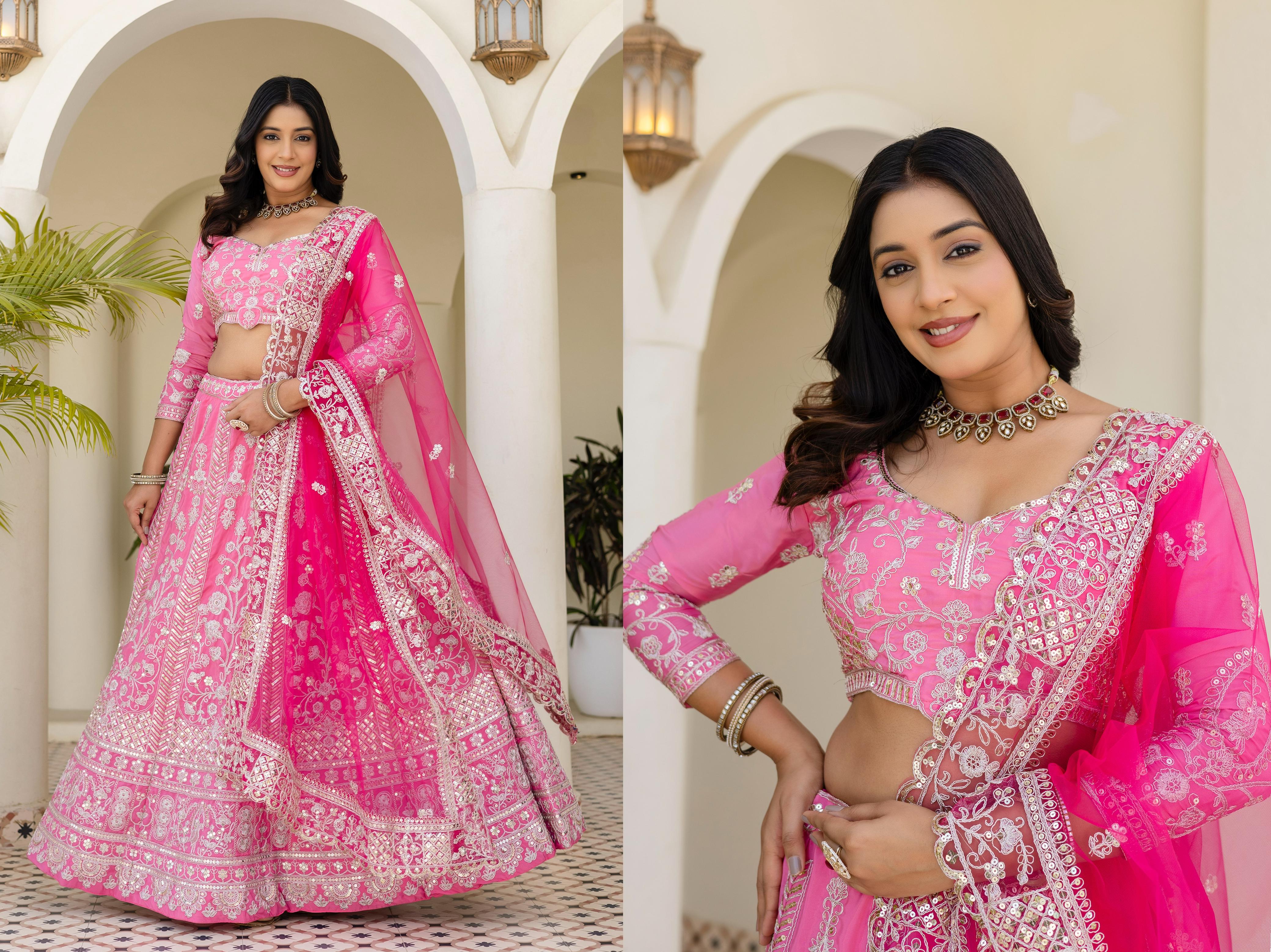 Radiate elegance in this stunning pink lehenga, adorned with intricate embroidery and timeless charm.