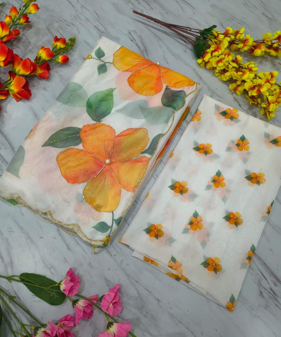 White Floral Print Silk Saree