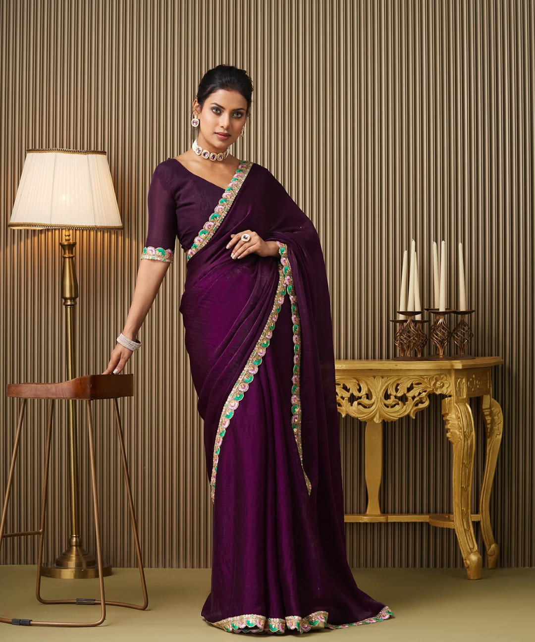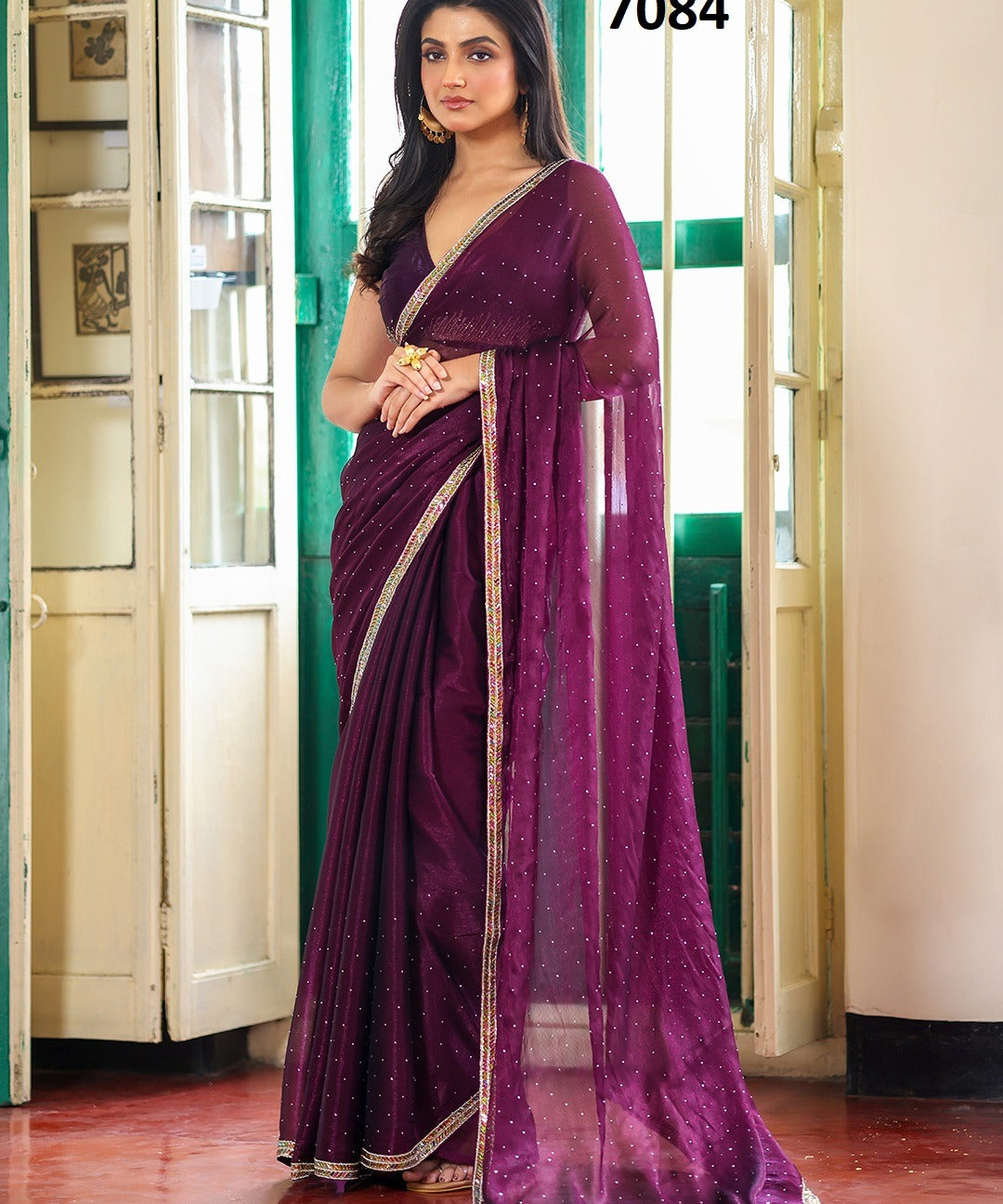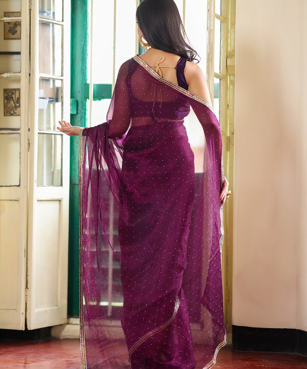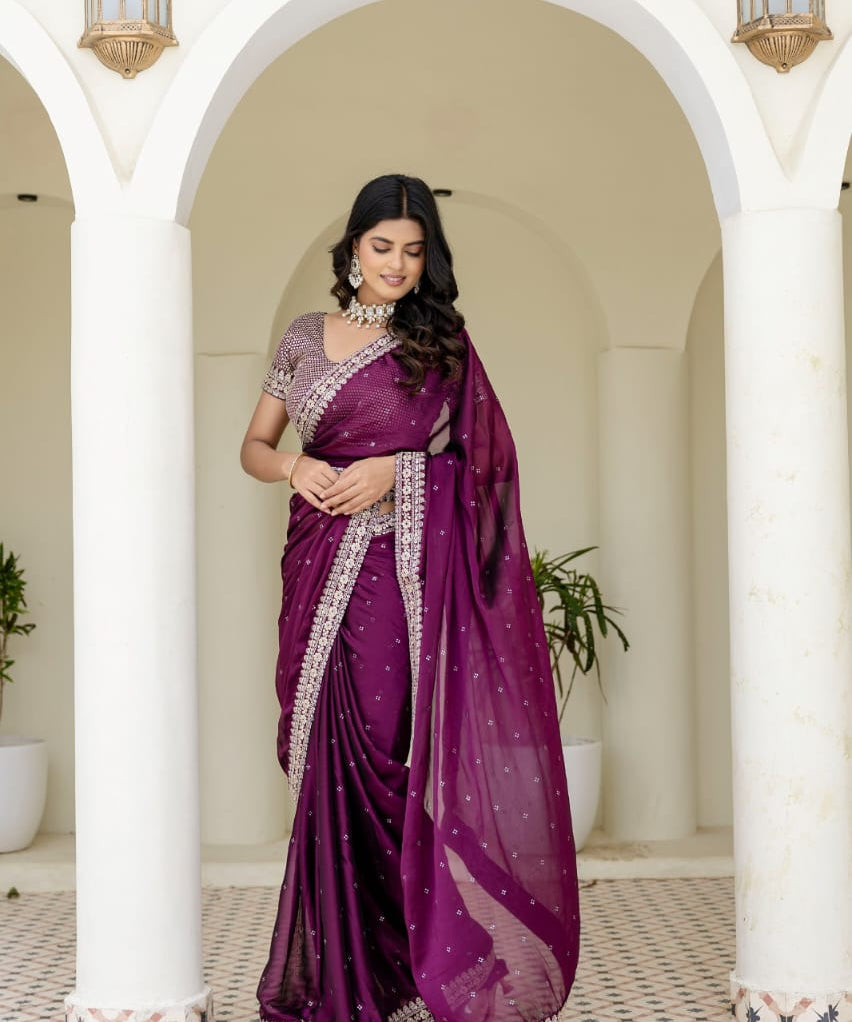 Wine Embellished Chiffon Saree