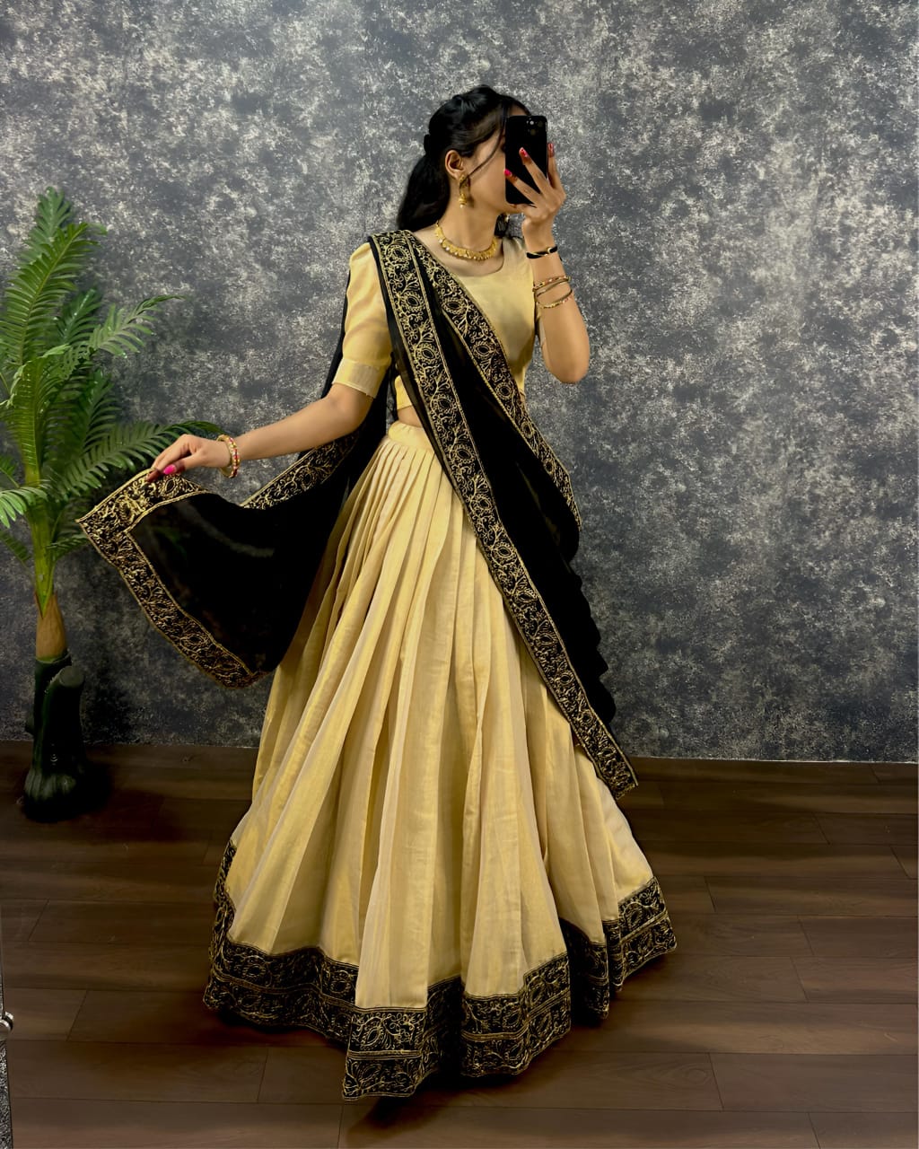 Heritage redefined in this Tissue Cotton lehenga choli. Perfectly adorned with intricate zari weaving for a regal touch🪸