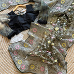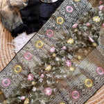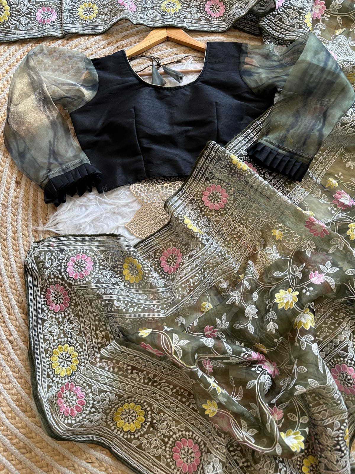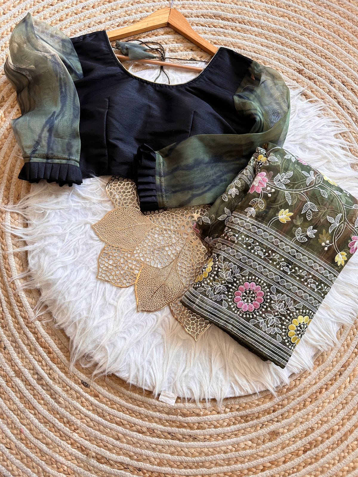 Organza printed Saree With Kashmiri Thread Work in Full saree With piping  on Border With organza and raw silk blouse