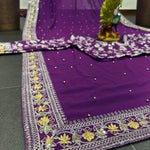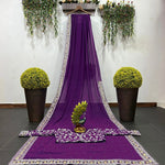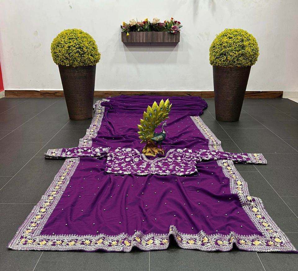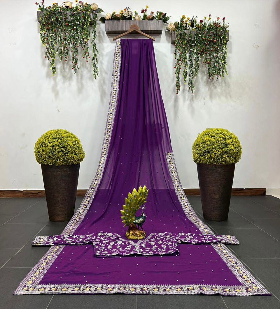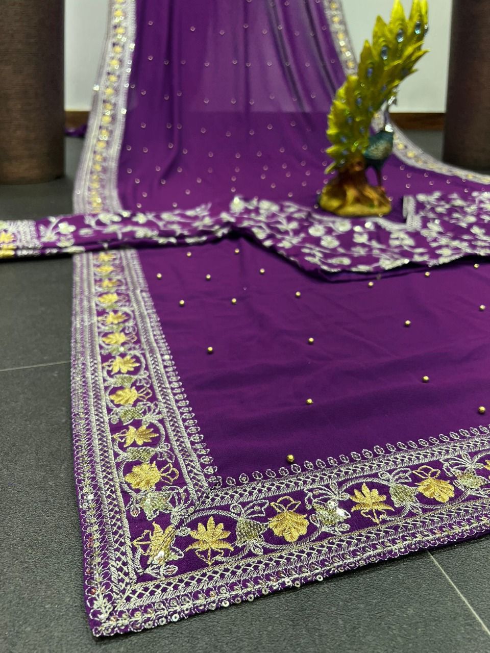 Looking some one for this same colour beautiful Designer Saree on premium Faux Georgette fabric with Thred with Moti work and blouse on Benglori silk fabric with Thred work.