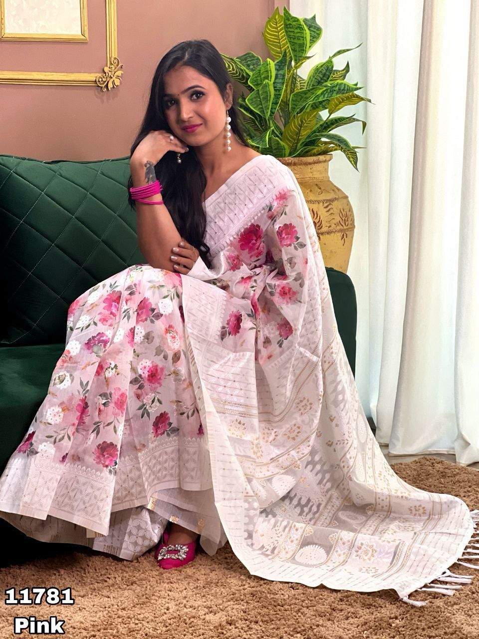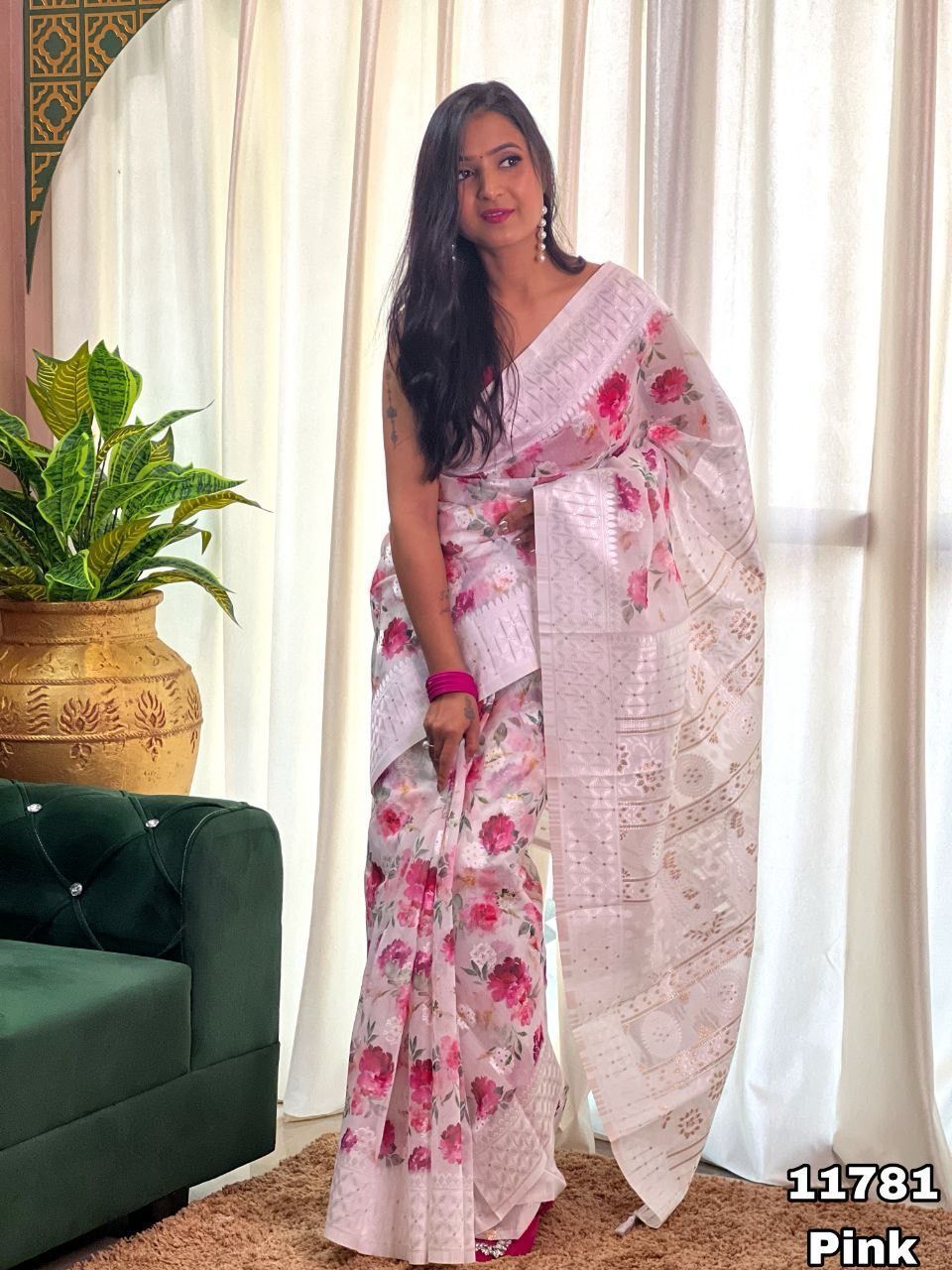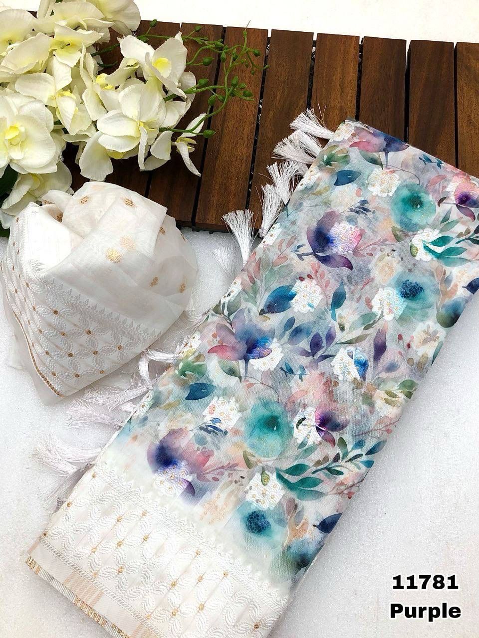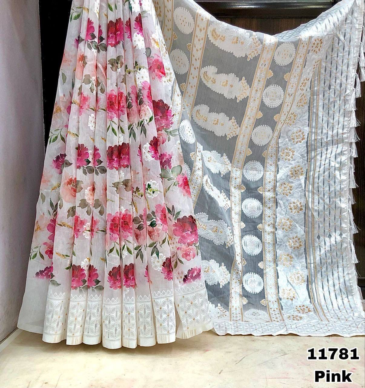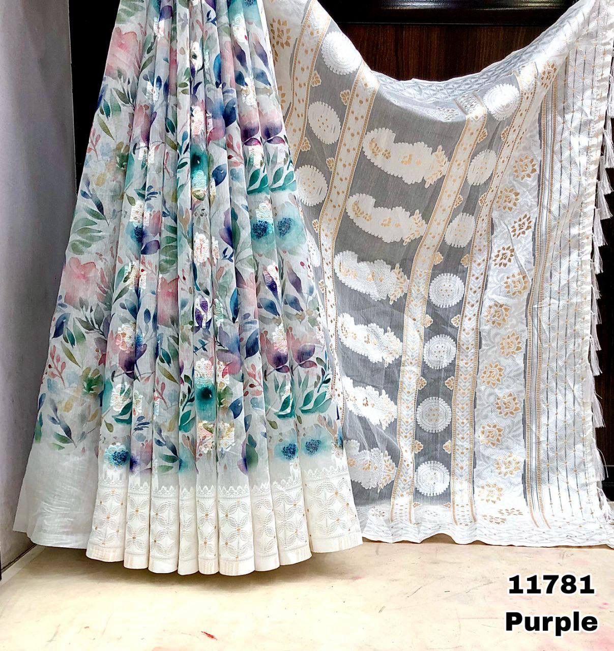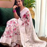 Fabric details - Soft Linen Lucknowi floral digital print with Lucknowi style weaving butti comes with rich weaving Lucknowi pallu