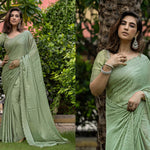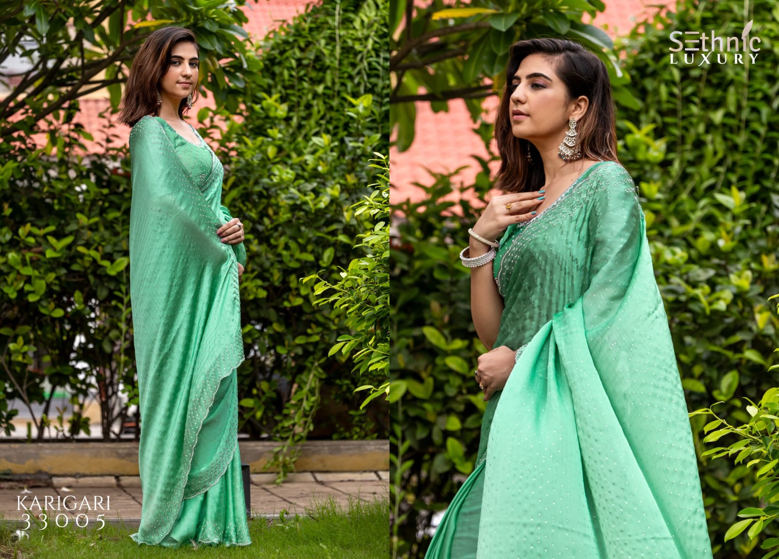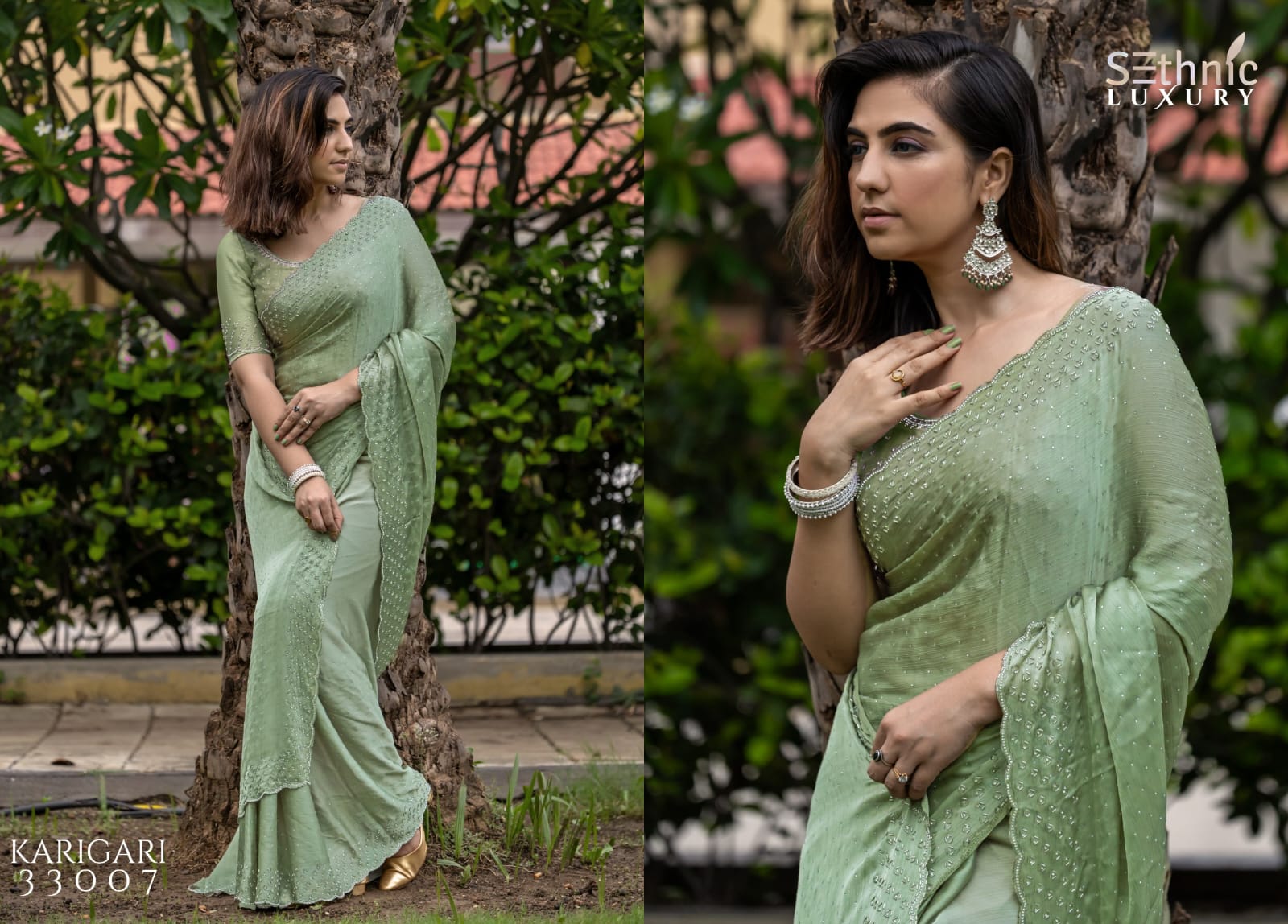 Our Pure Satin Chiffon Handwork Sarees Are The Epitome Of Elegance And Luxury, Blending The Silky Smoothness Of Satin With The Airy, Delicate Texture Of Chiffon. Adorned With Intricate Handwork, These Sarees Create A Stunning Visual Impact, Making It An Ideal Choice For Those Seeking To Make A Graceful And Memorable Statement.