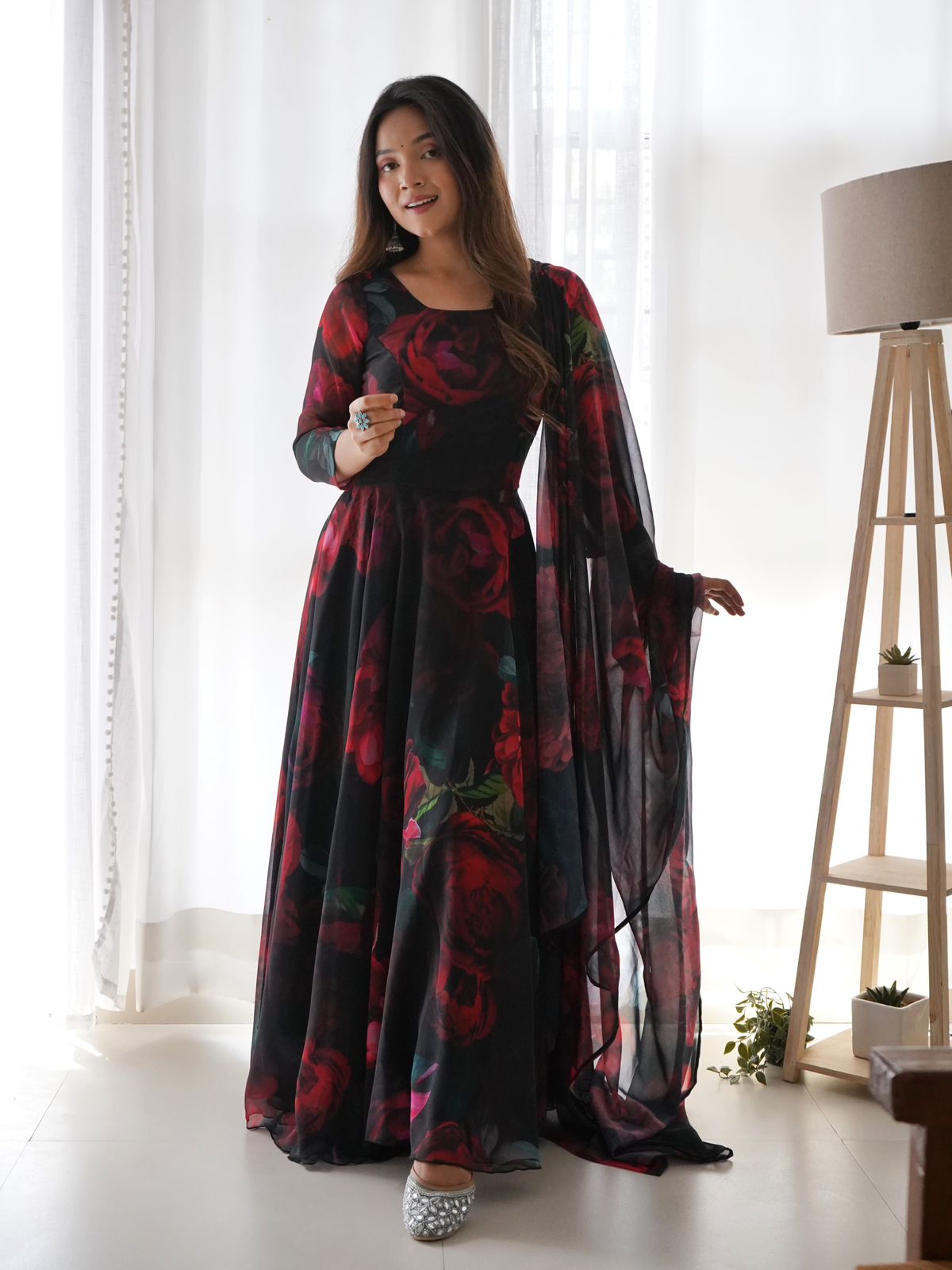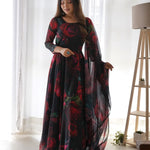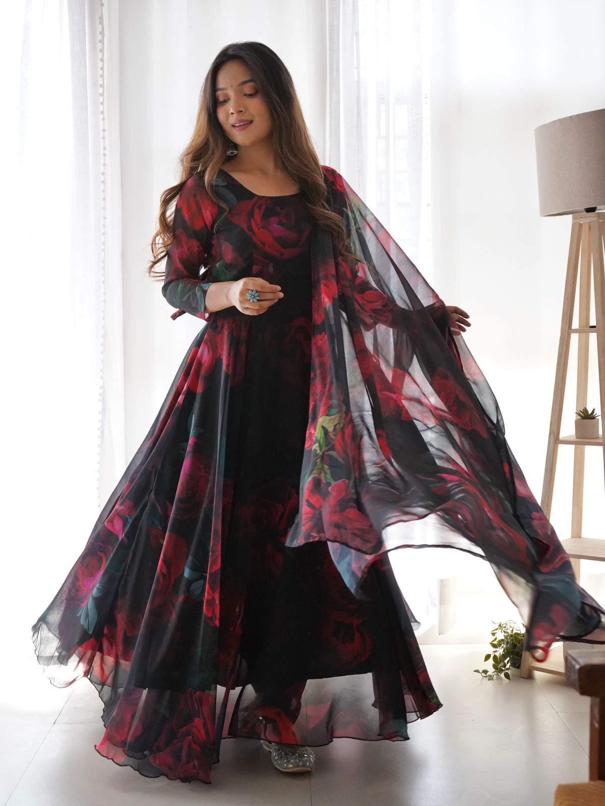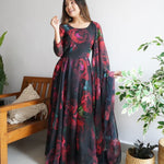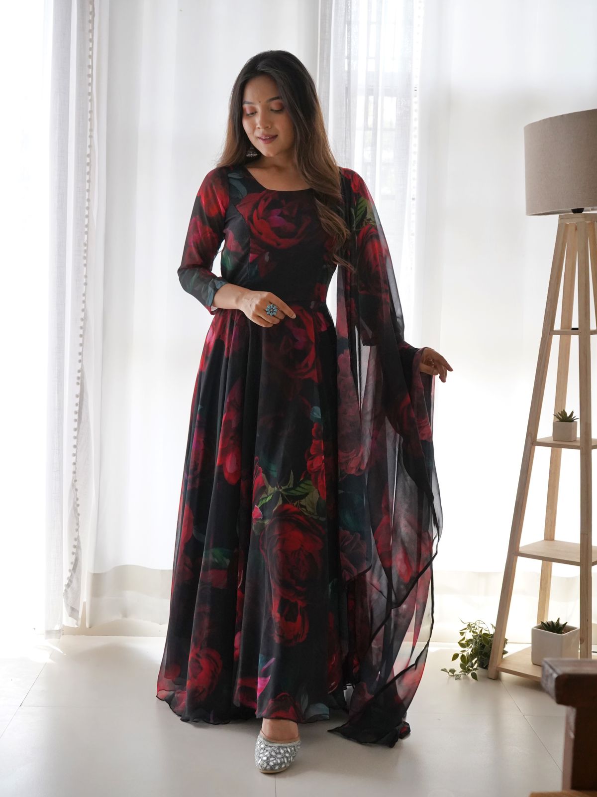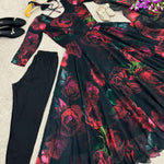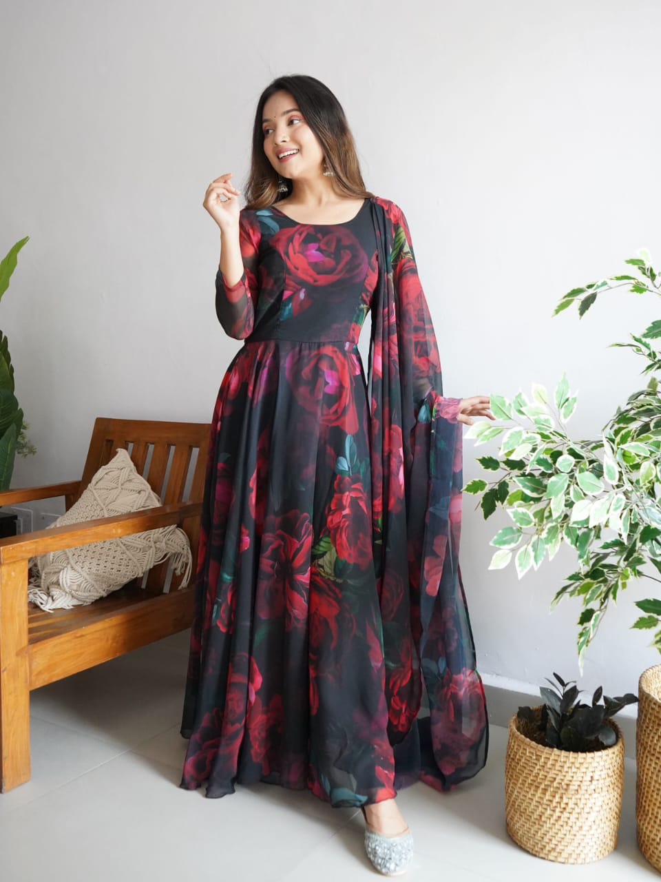 👚Gown Fabric:Heavy Faux Georgette With Beautiful ❤️ Digital Print Work With Attached Pad With Full Sleeve and Latkan Dori With Fully Flair