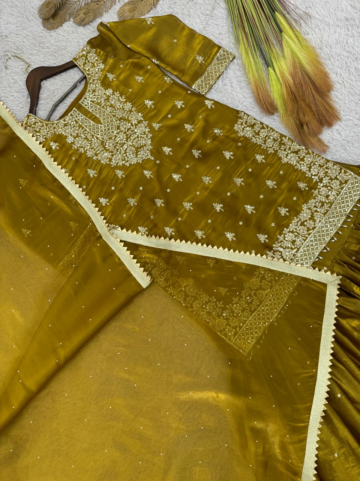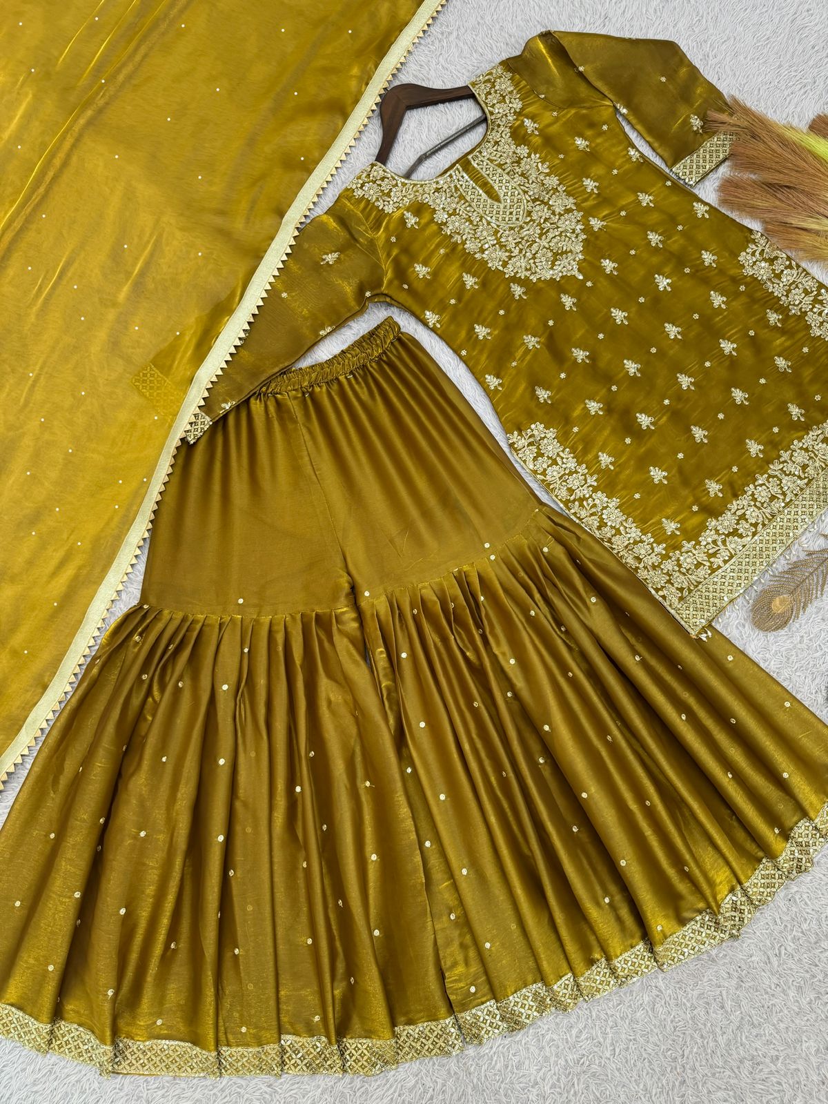 Olive Shiny Embroidered Top Sharara