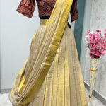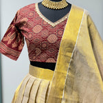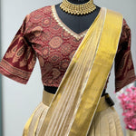 The elegant white and gold half saree exudes timeless grace and sophistication, making it a perfect choice for special ONAM occasions and cultural events. The intricate detailing and delicate fabric create a stunning ensemble that is sure to turn heads and leave a lasting impression. Whether it's a wedding, festival, or formal gathering, this halfsaree lehengas is a beautiful representation of traditional Indian attire, showcasing the rich heritage and craftsmanship of the culture.