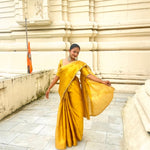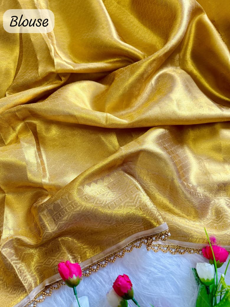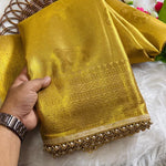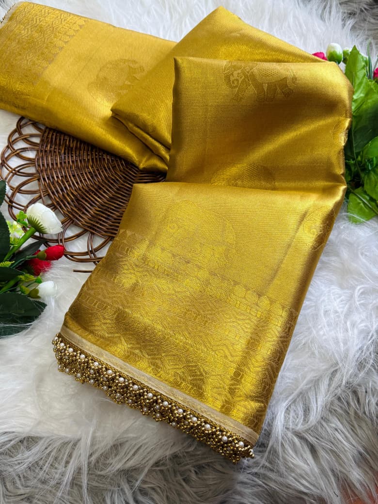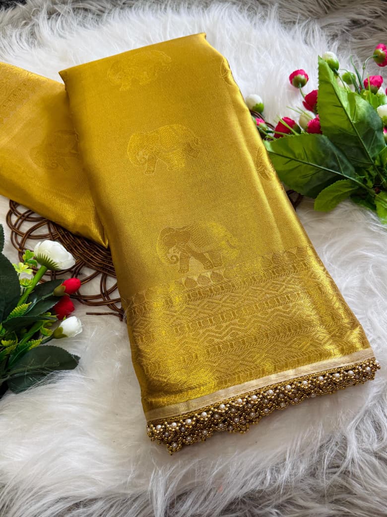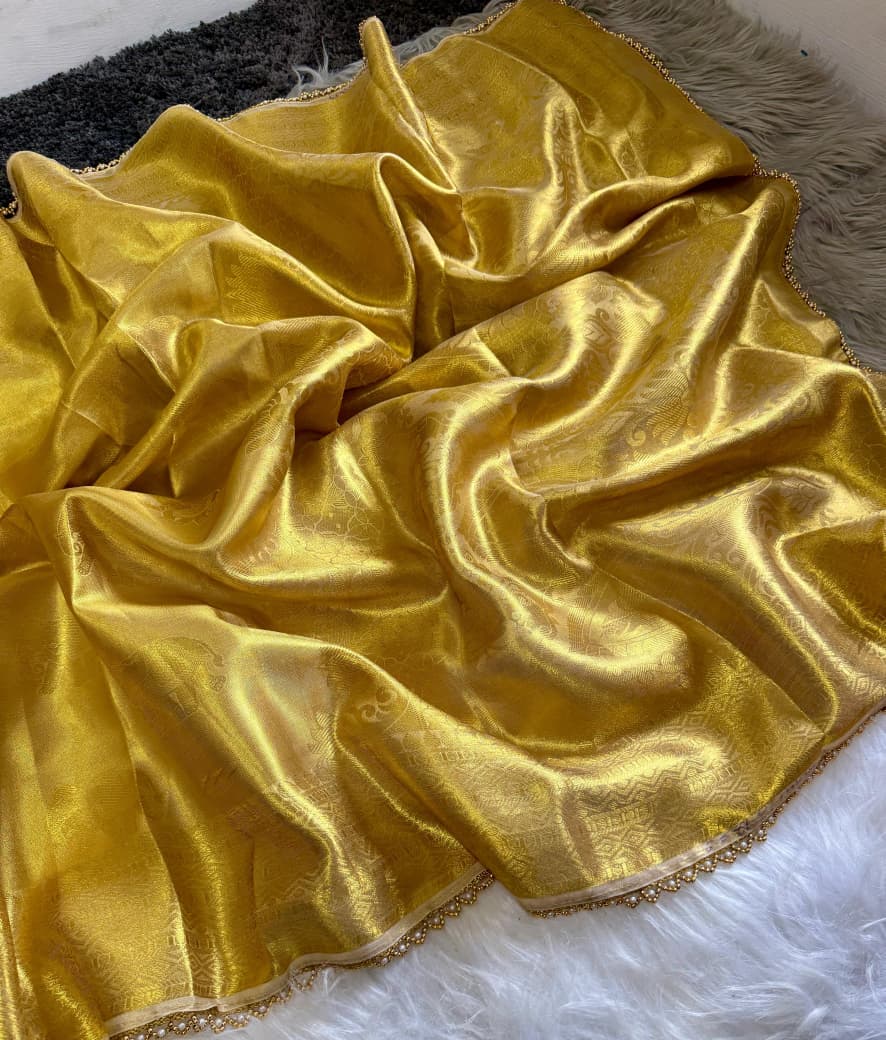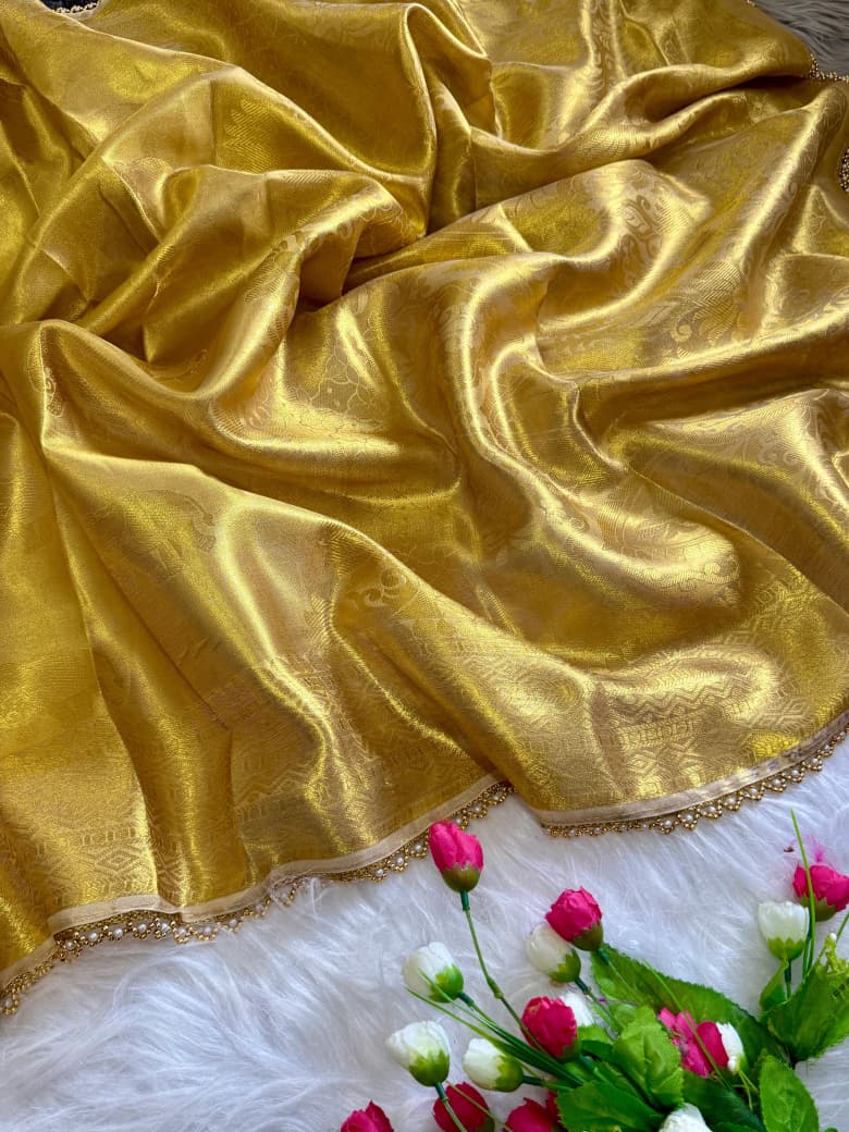 "Golden beauty! 💃🏽✨ Inspired by Rekha ji, this golden tissue silk saree has beautiful ghungroo and pearl border, adding a touch of elegance and glamour. 👗💫 Perfect for special occasions.