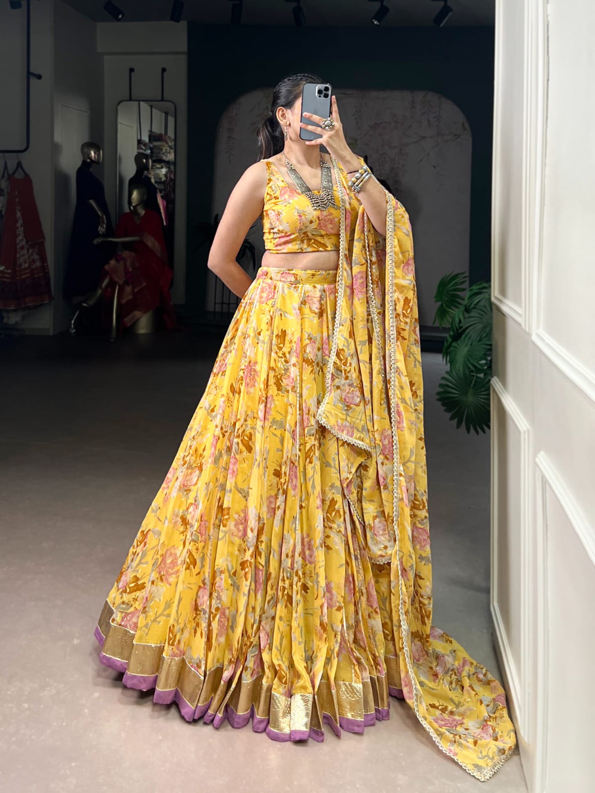 Lehenga Work : Floral Print And Foil Print With Embossed Design With Gotta Patti Lace Touch Up