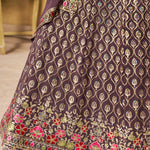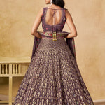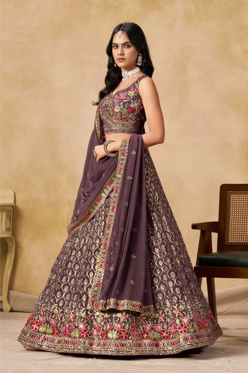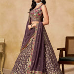 ✨ *Lehenga*: This stunning light-purple georgette lehenga features rich golden zari weaving with floral embroidery along the border. The flared silhouette enhances the regal charm, highlighted by shimmering sequins and intricate detailing.
