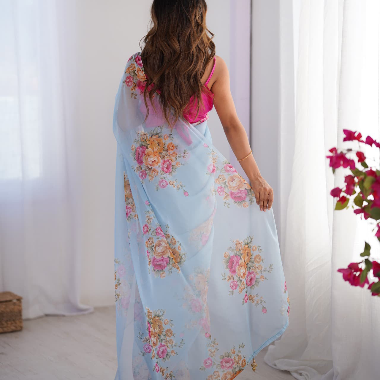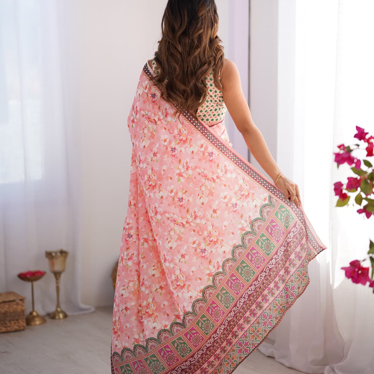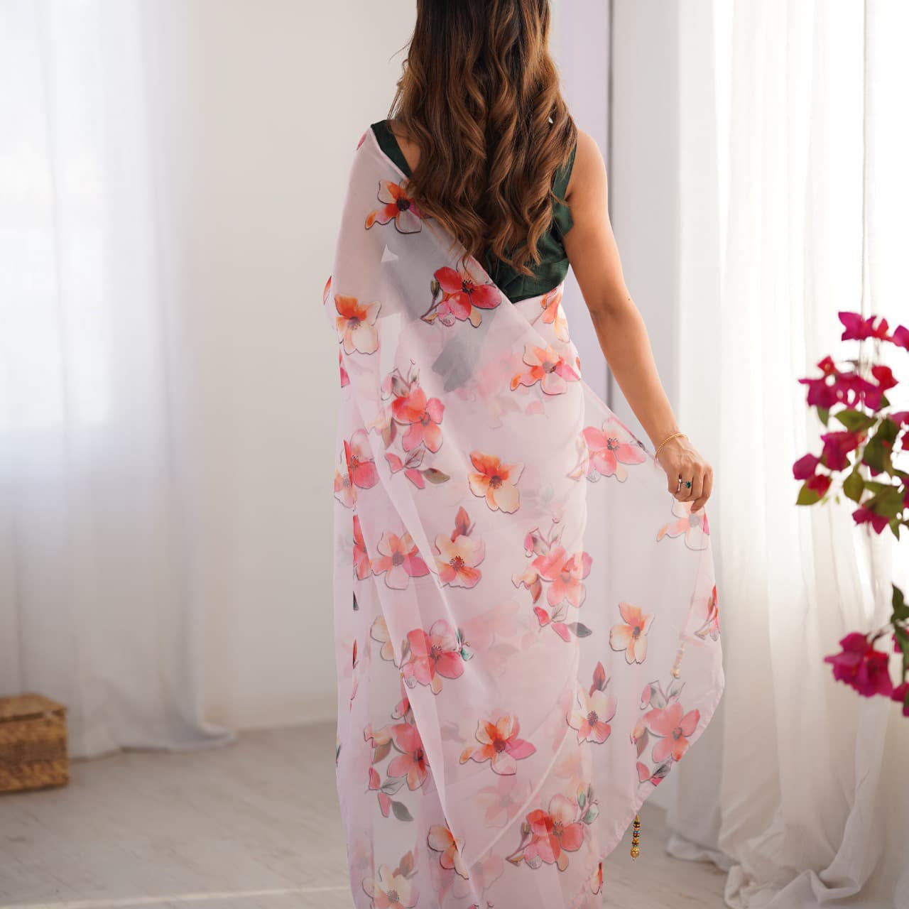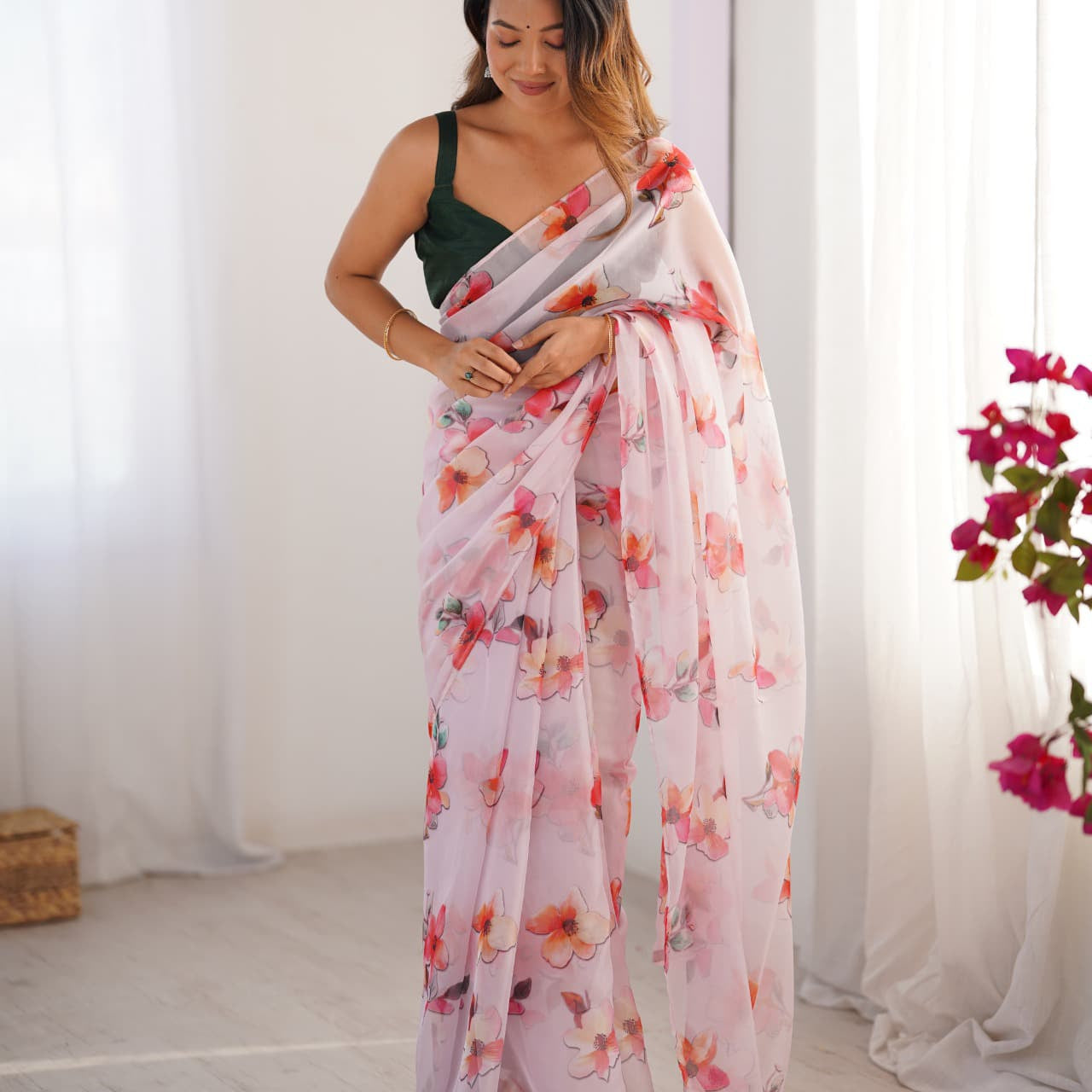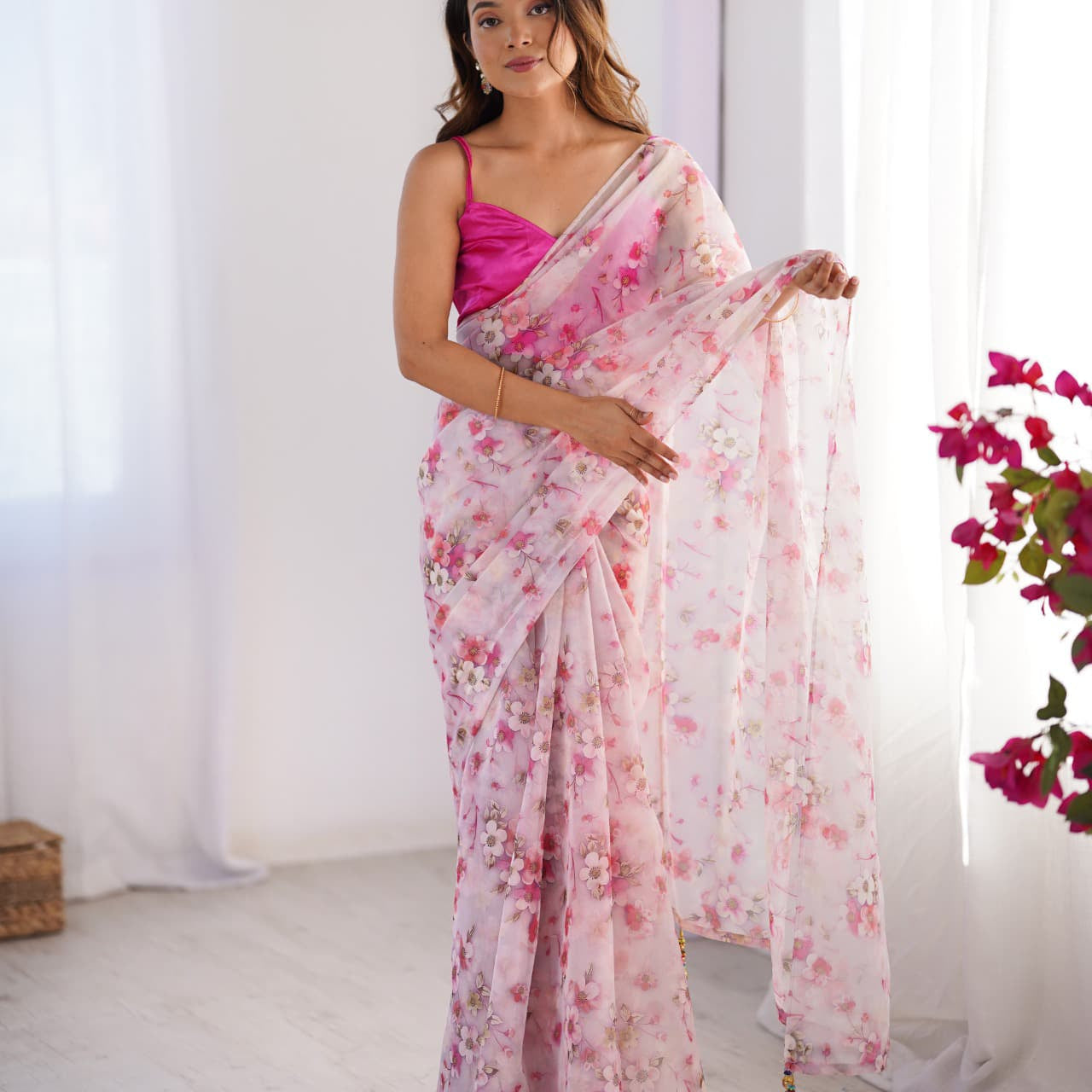 Pink Flower Print Organza Saree