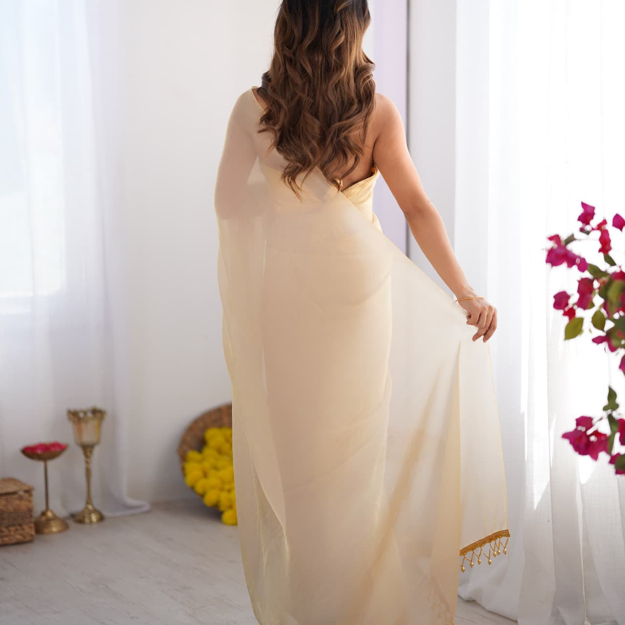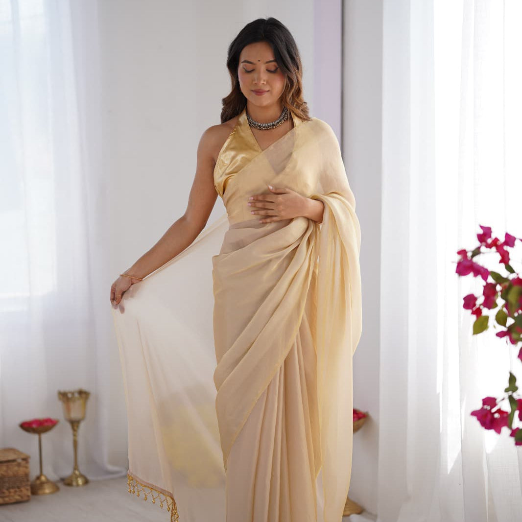 Cream Colord Satin Organza Saree