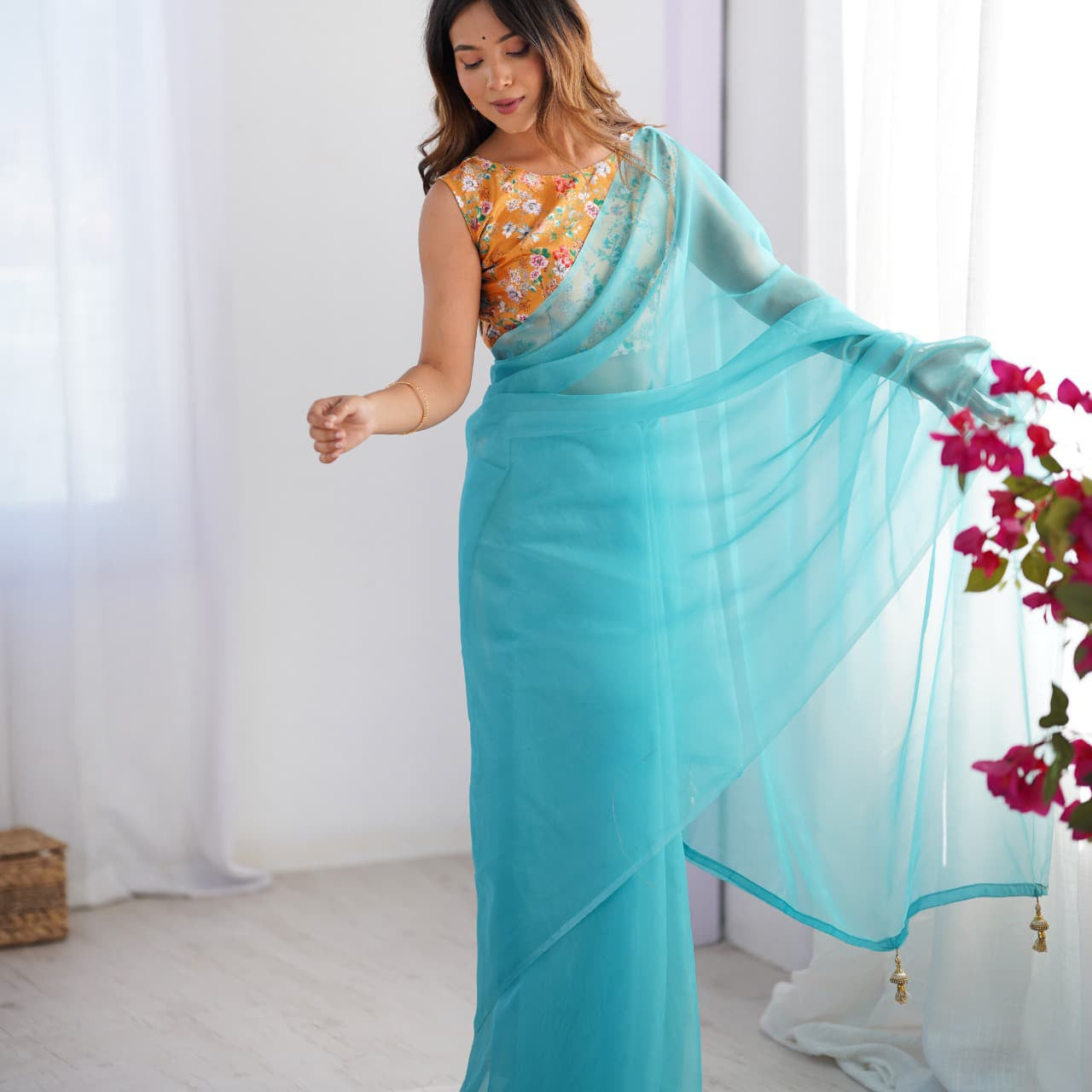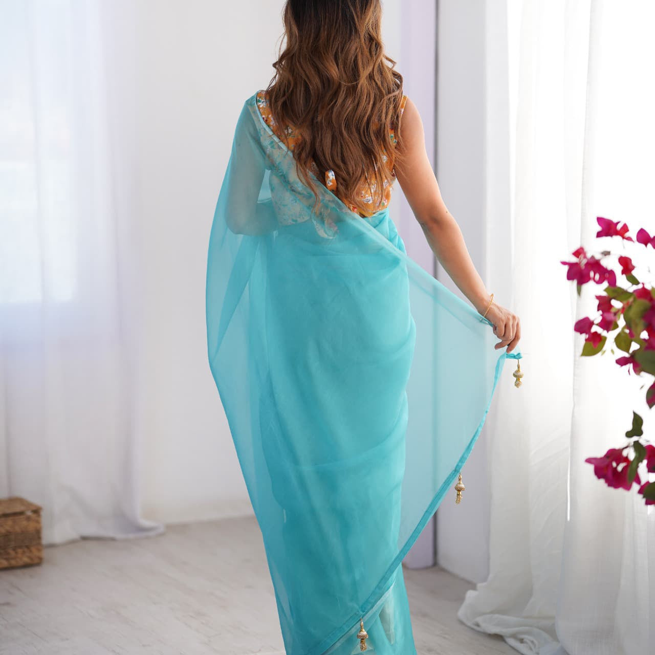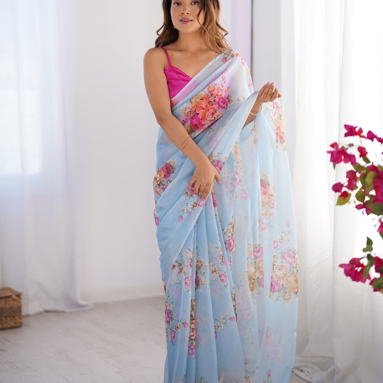 Sky Flower Print Organza Saree