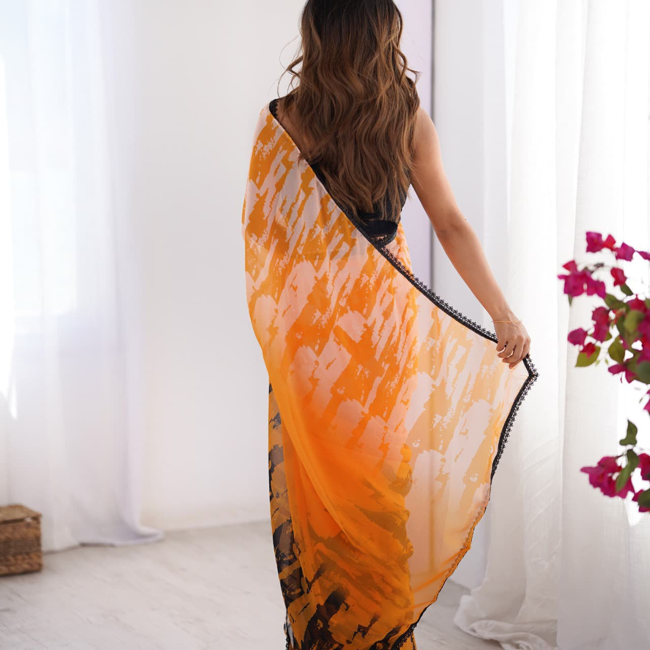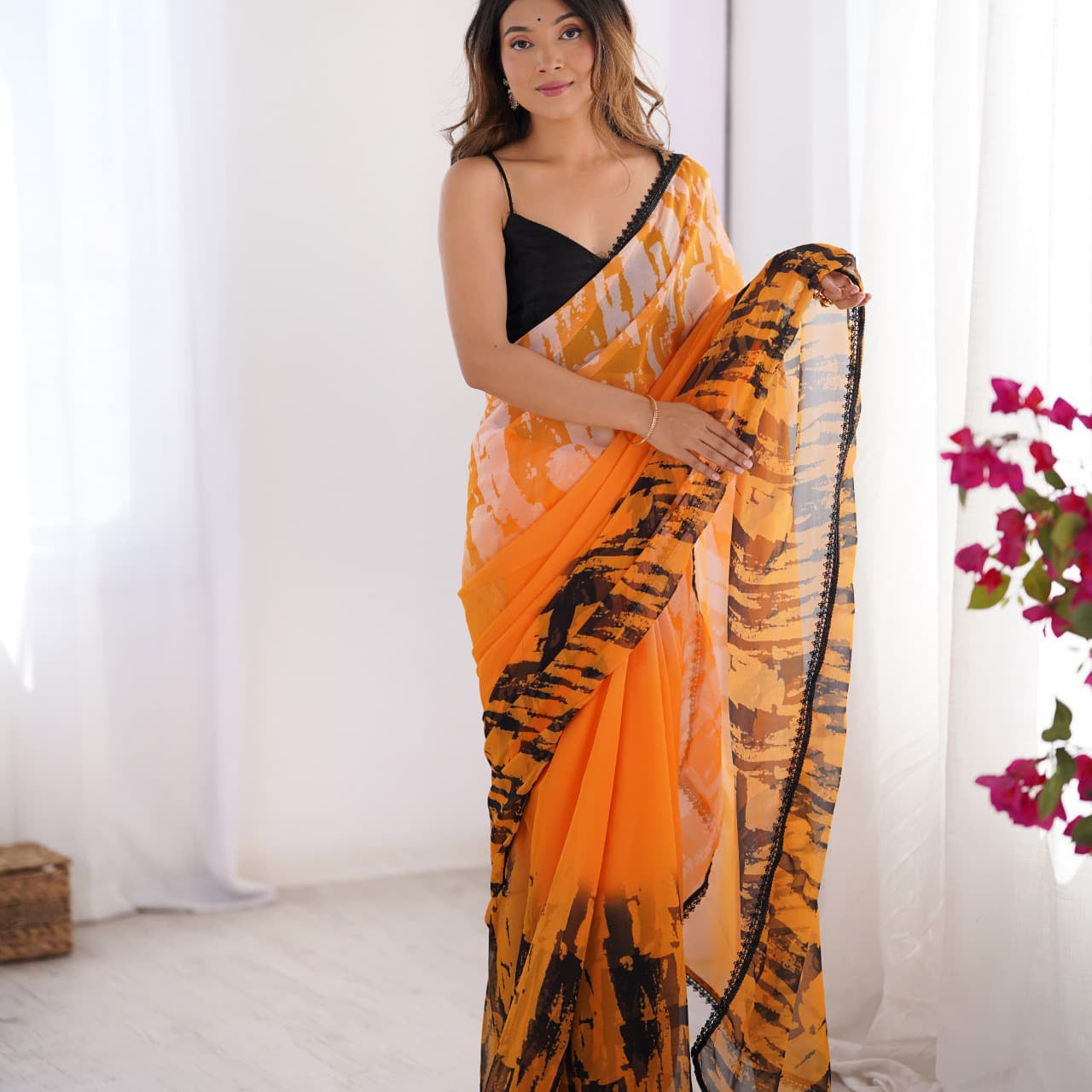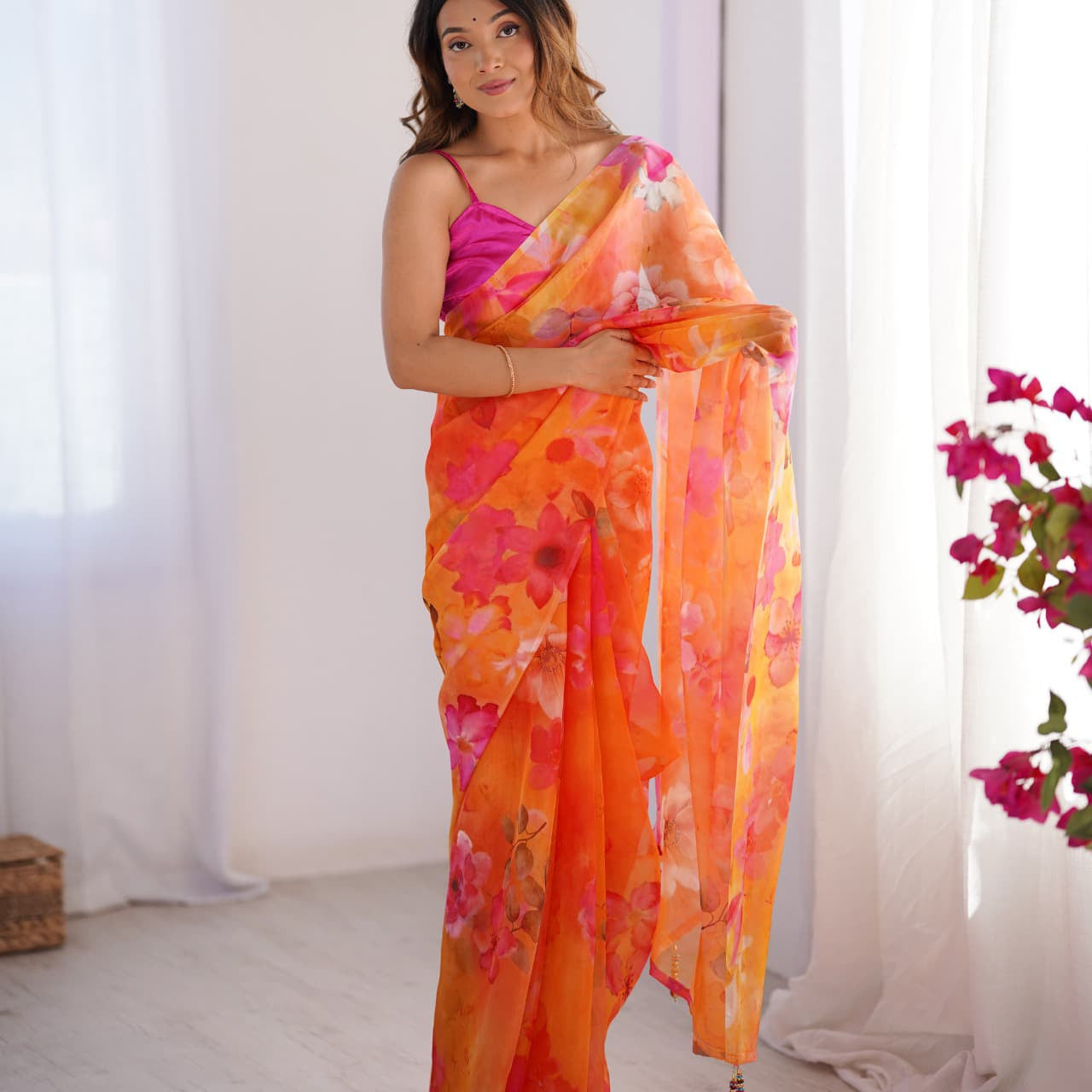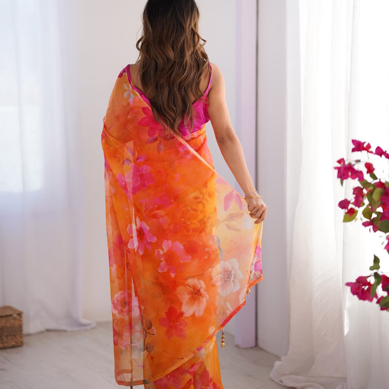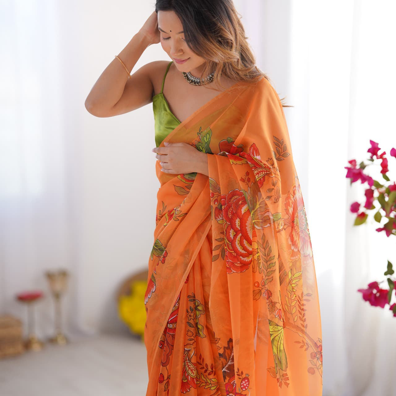 Orange Flower Print Organza Saree