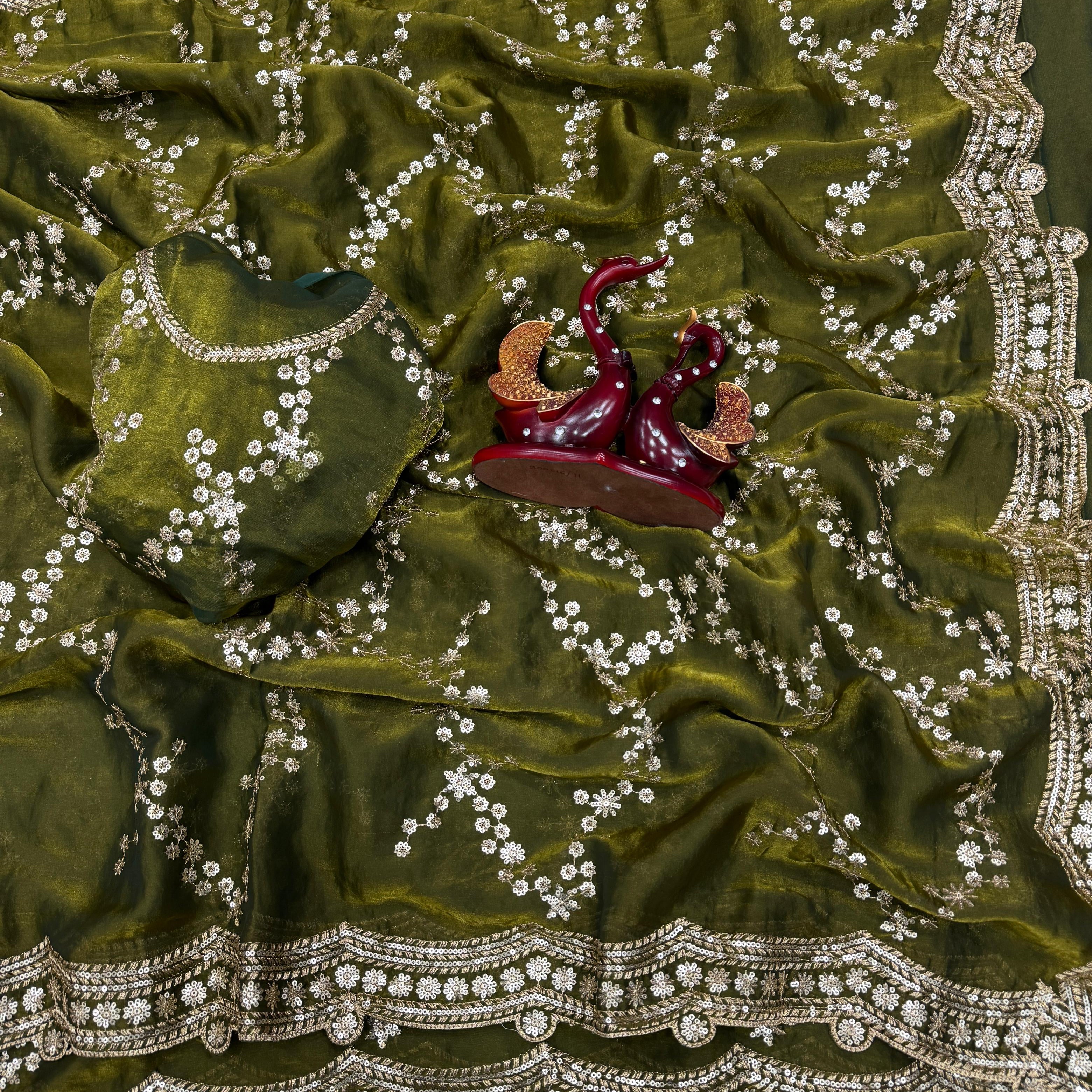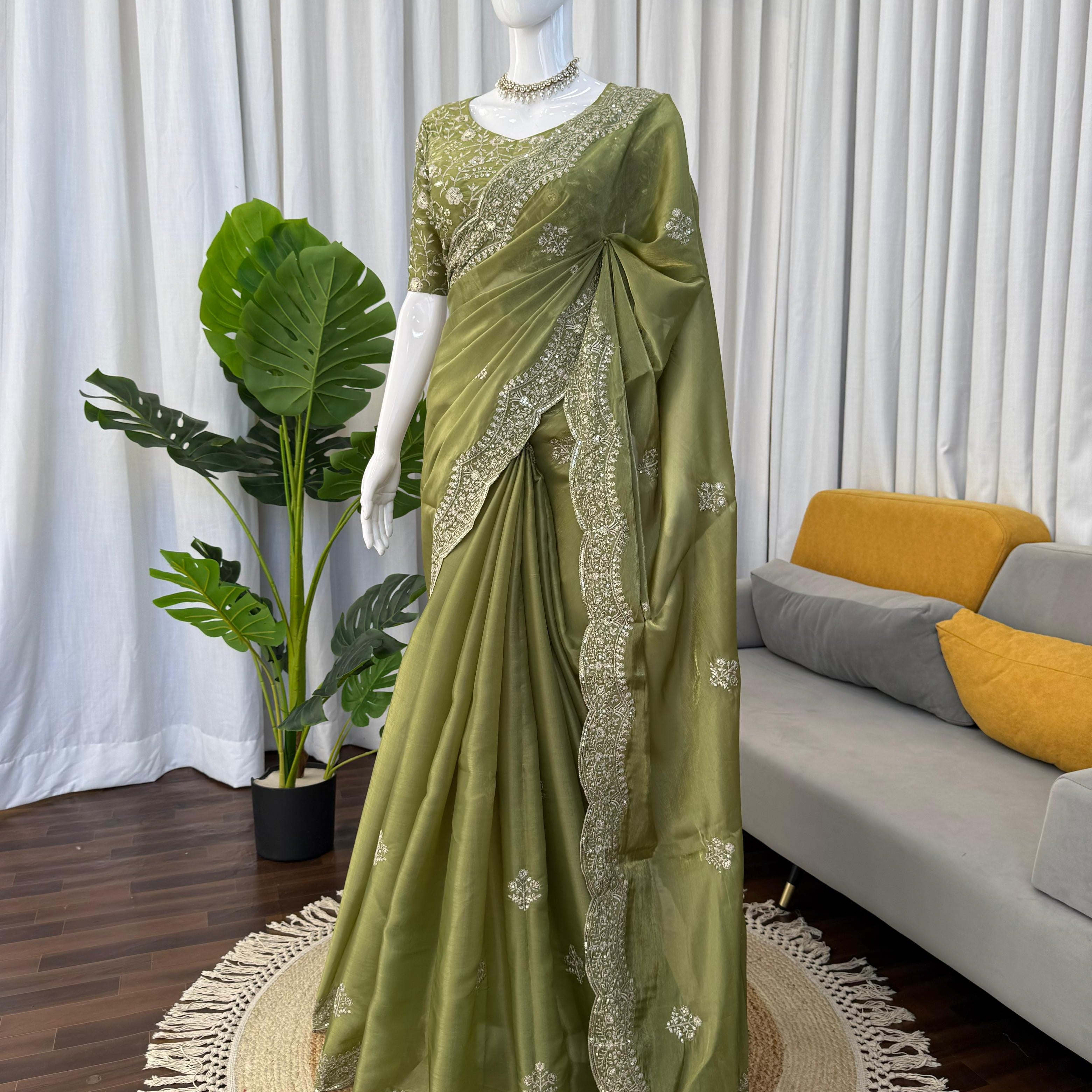 Golden Olive Designer Tissue Saree