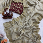 😍Unveil your inner fashionista with our stunning muted Champaign gold designer saree paired with the most sought-after corset blouse in rich red.