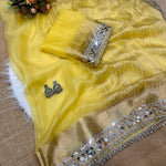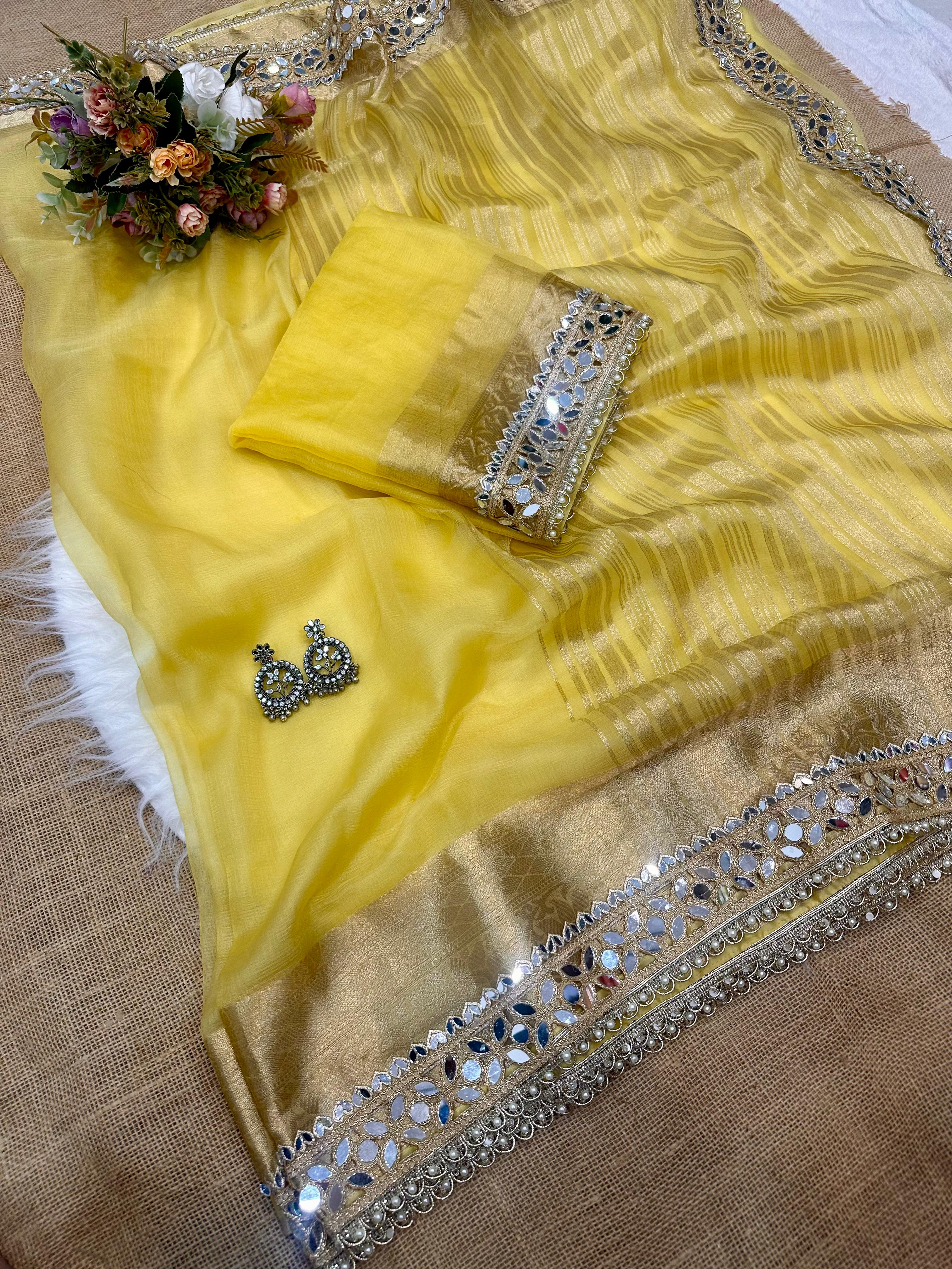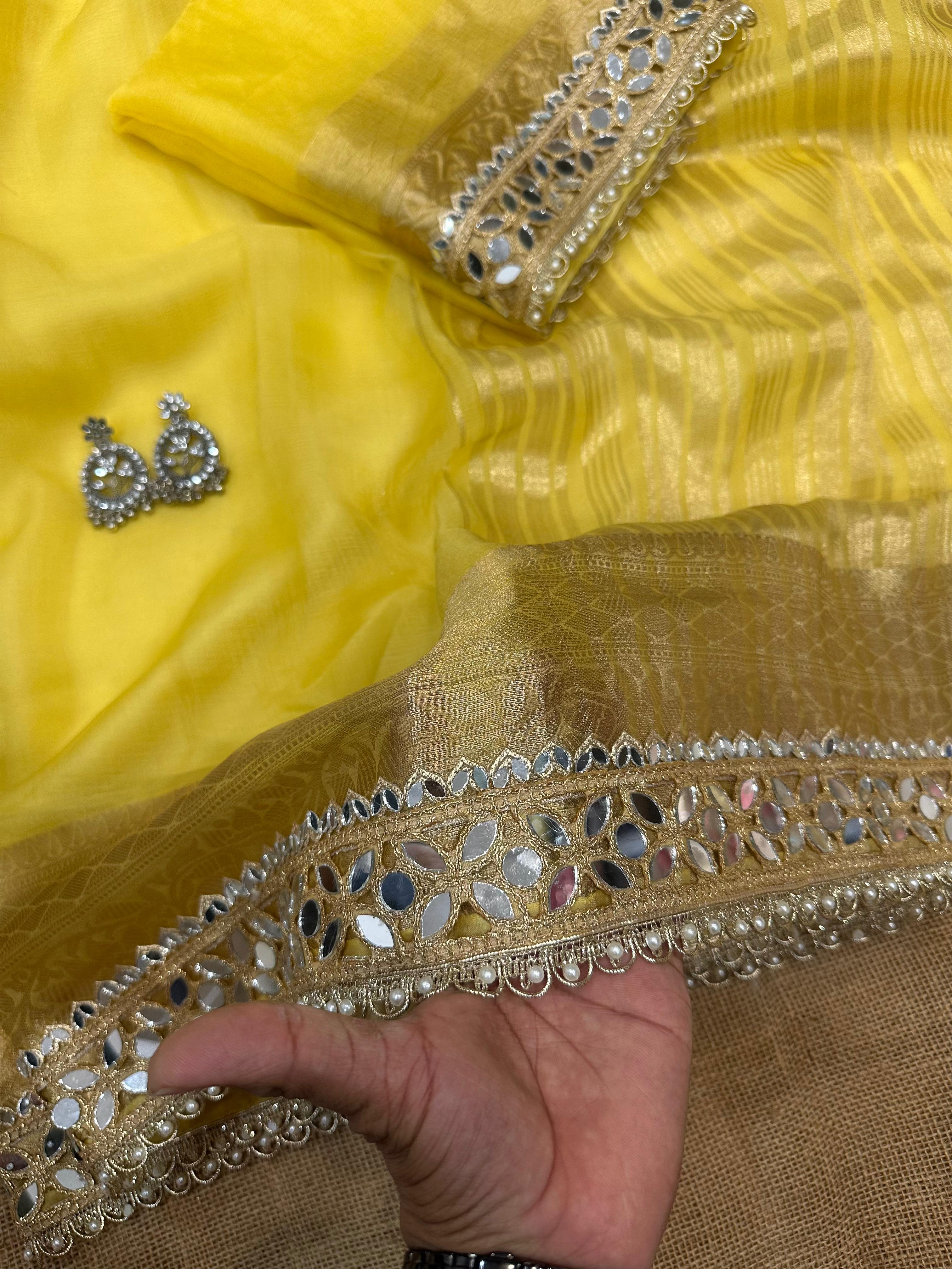 *New trending designer original mirror work lace border with soft organza weaving border saree with weaving rich pallu*