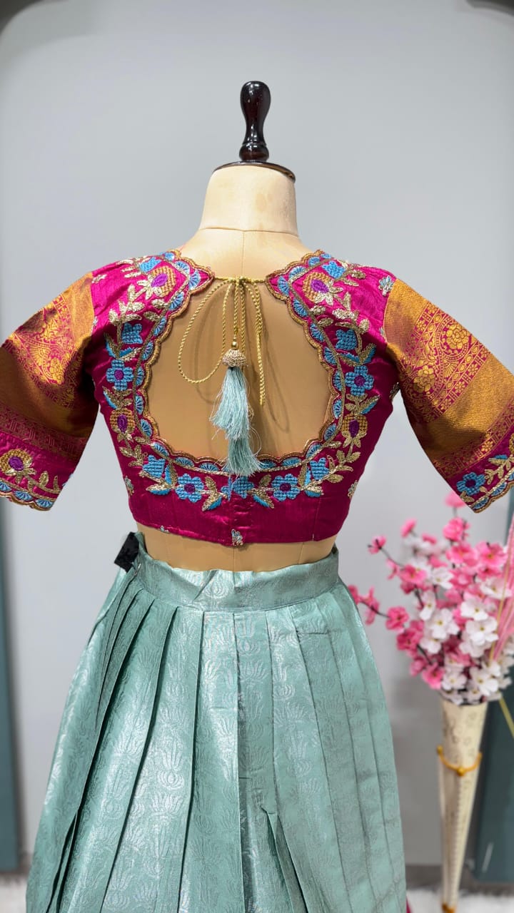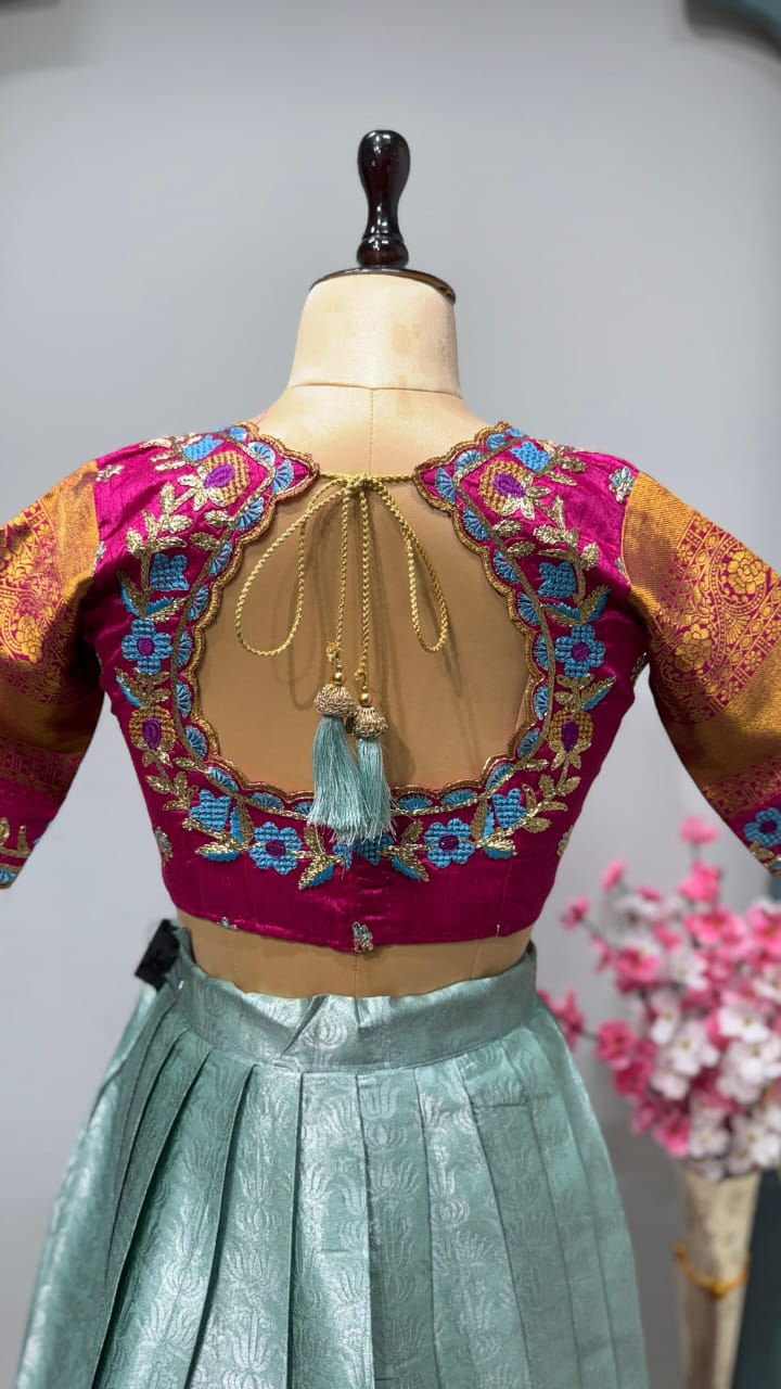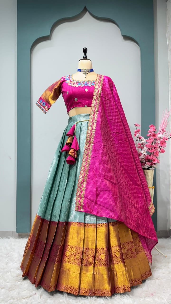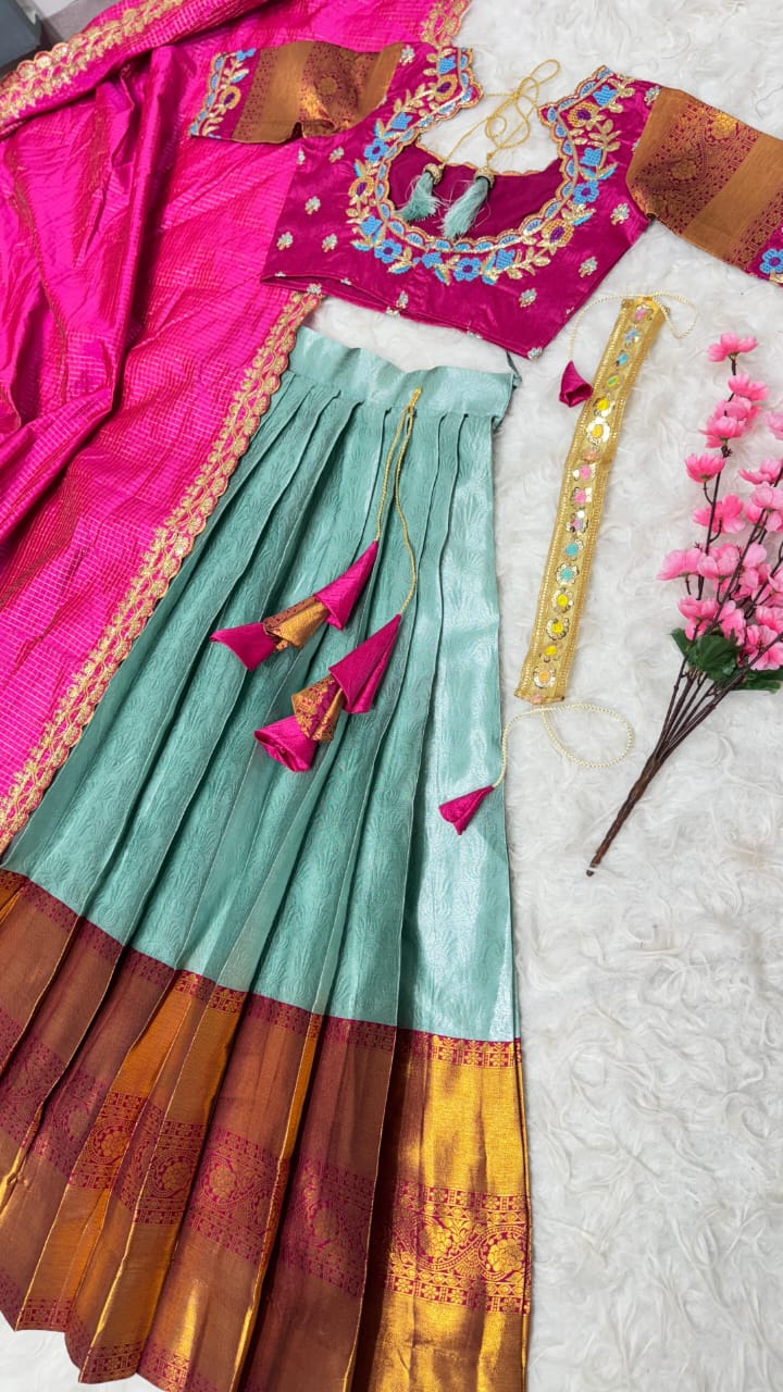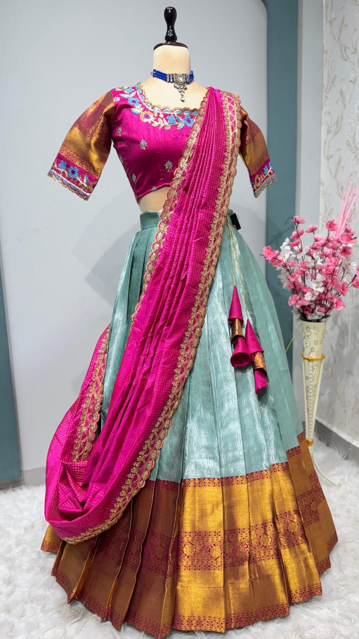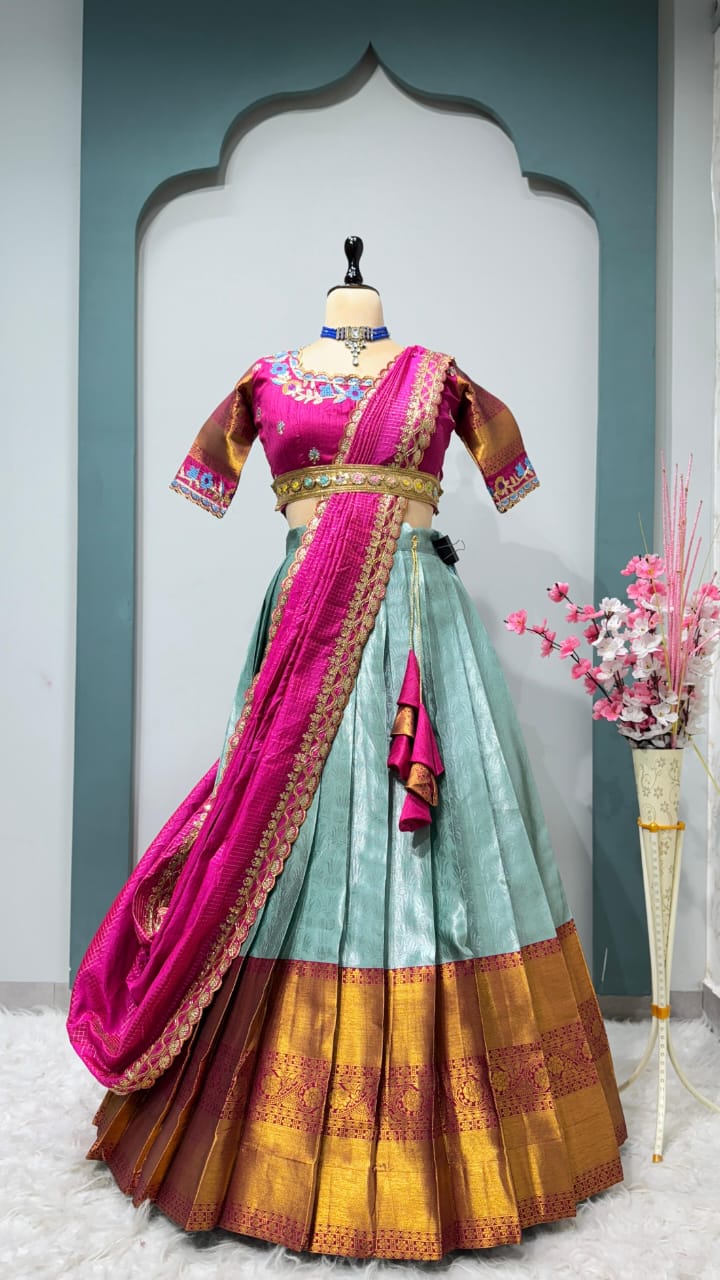 Launch New  Exclusive Designer  Premium Quality Pure  Kanjivaram  silk full stiched Lehenga  With Full stiched    Designer Maggam work  blouse   With Maggam work with Rich butti work with Handwork lace border  dupatta which gives u totally Decent and Extraordinary look For this Festival Marriage Season