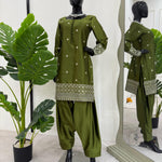 Looking for this same colour beautiful Designer Suit on Japan Satin Silk febric with Inner and Sequnce work and Dhoti on also Japan Satin Silk Febric.