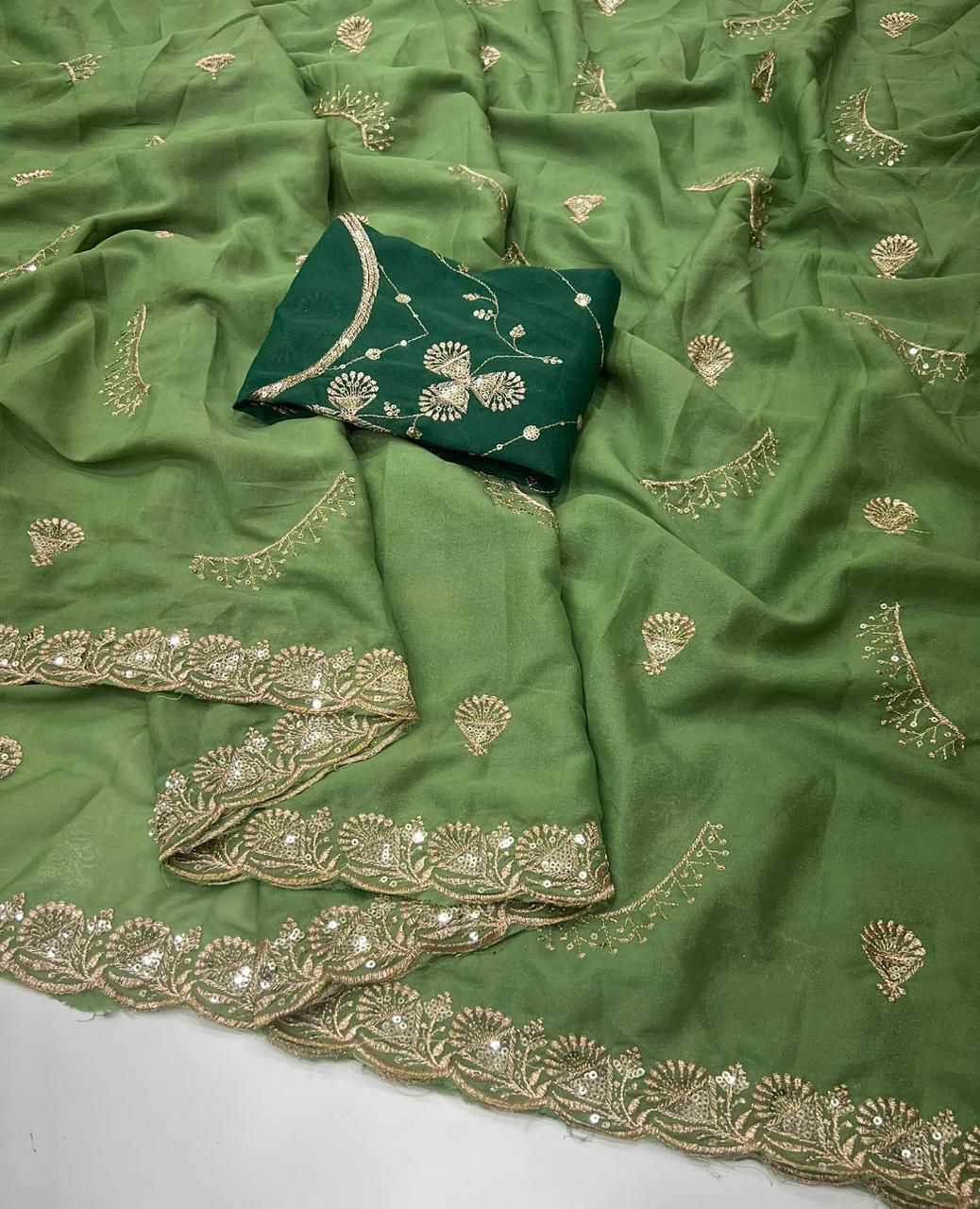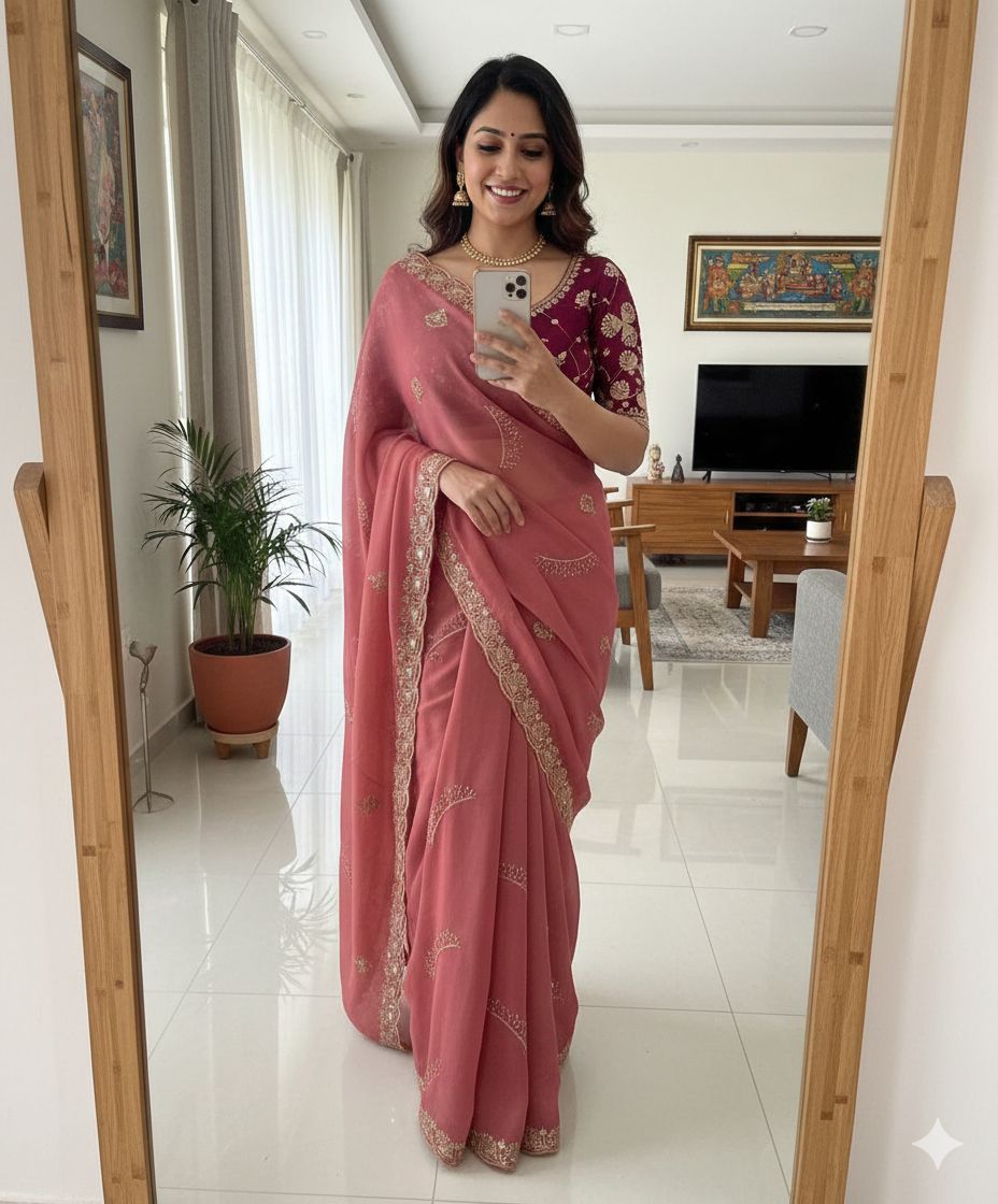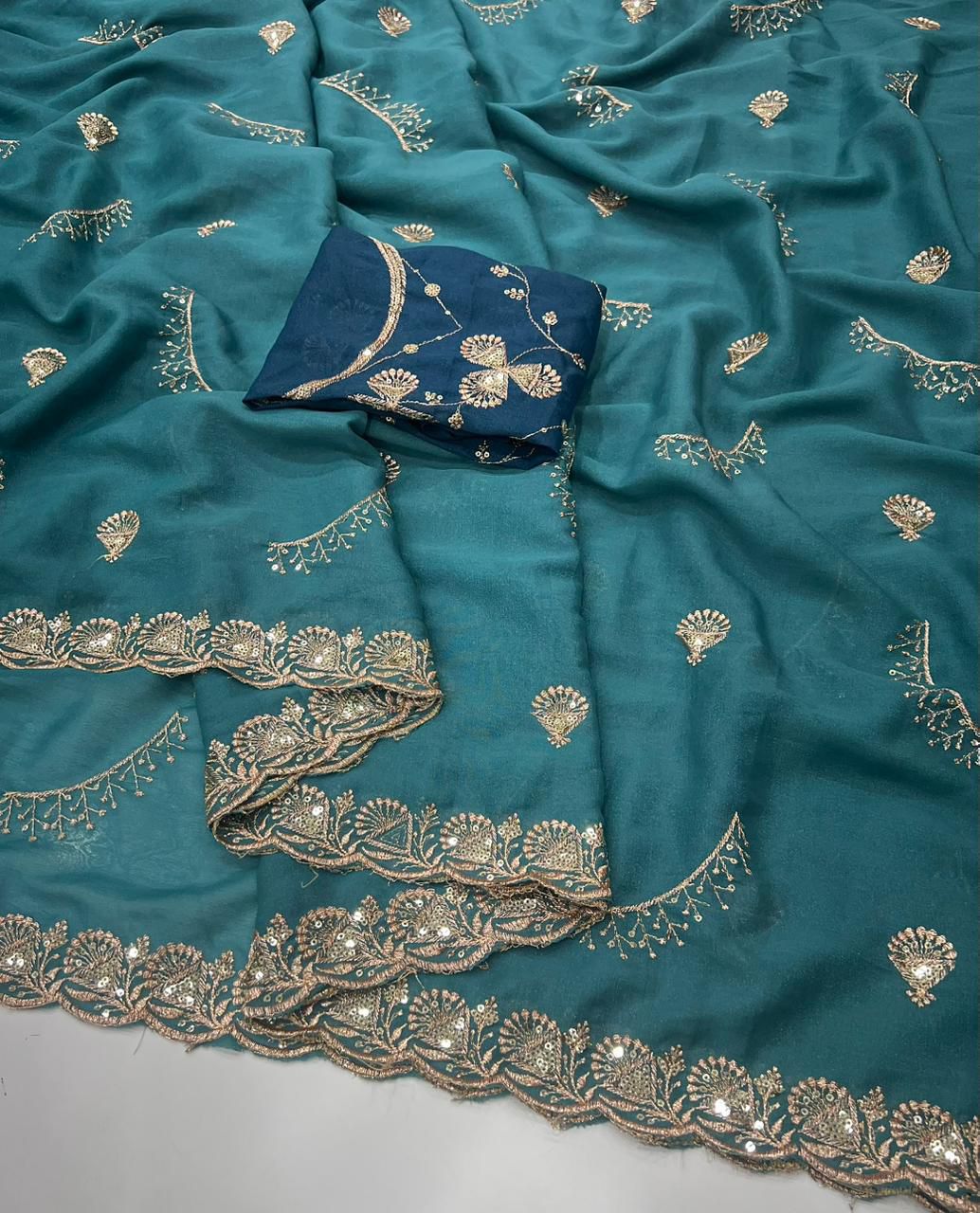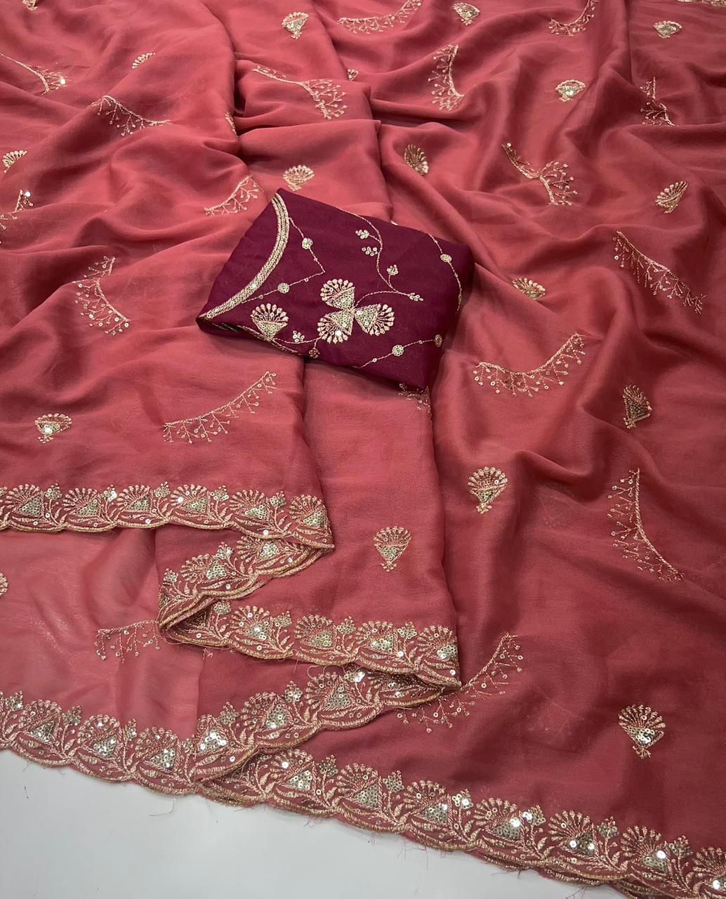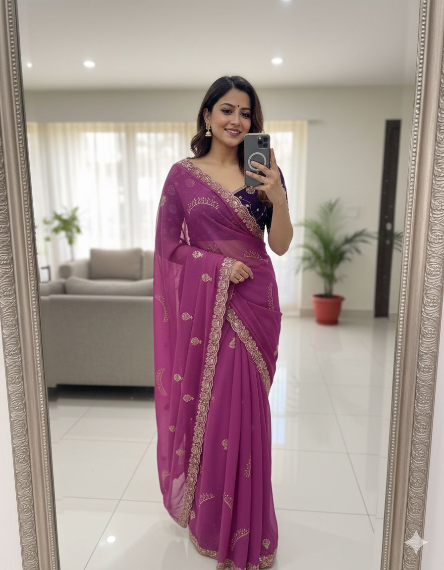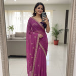 Star Georgette Multi Sequence Emrodairy Work Saree With Contrast Running Blouse