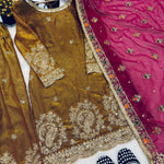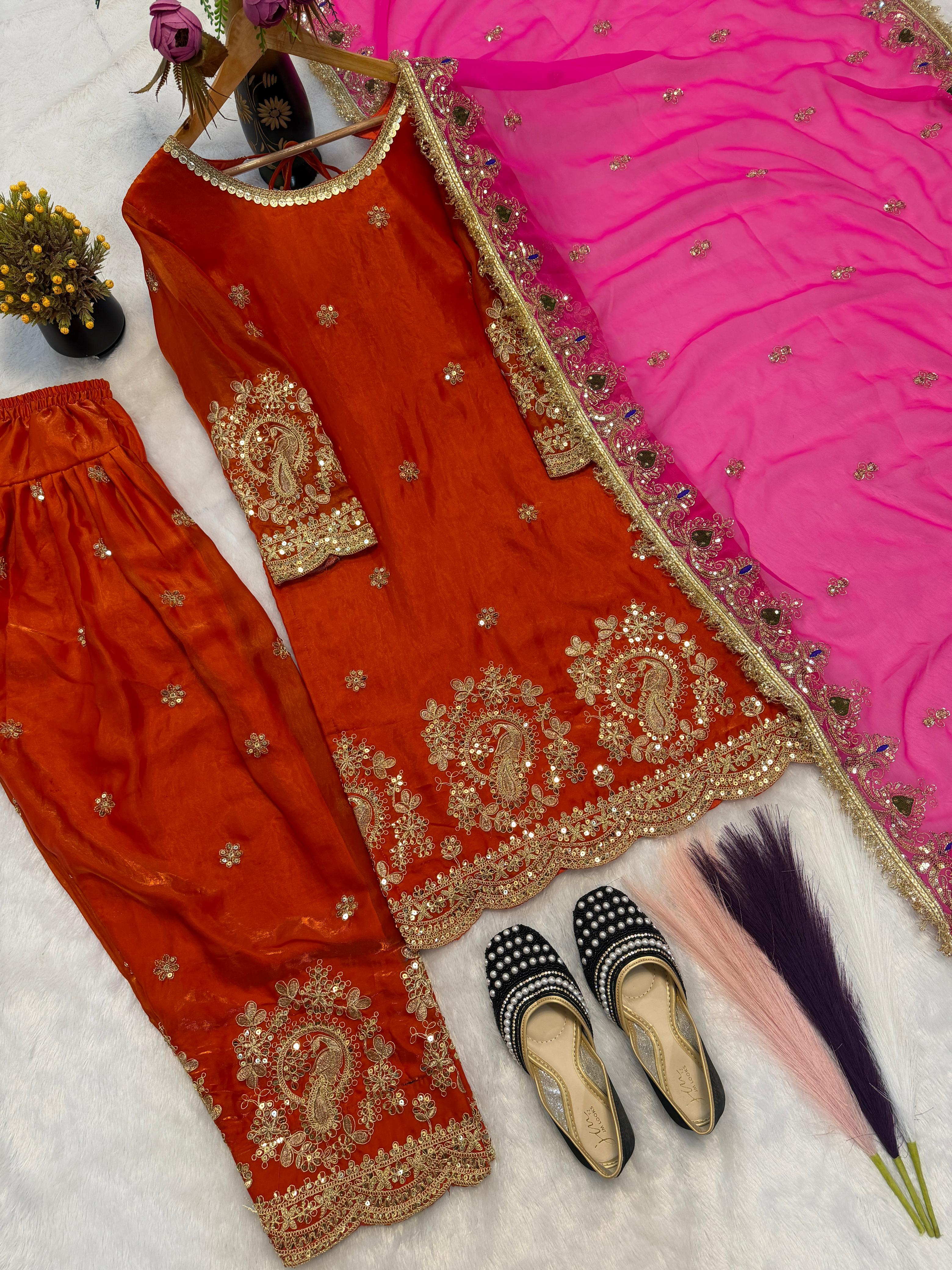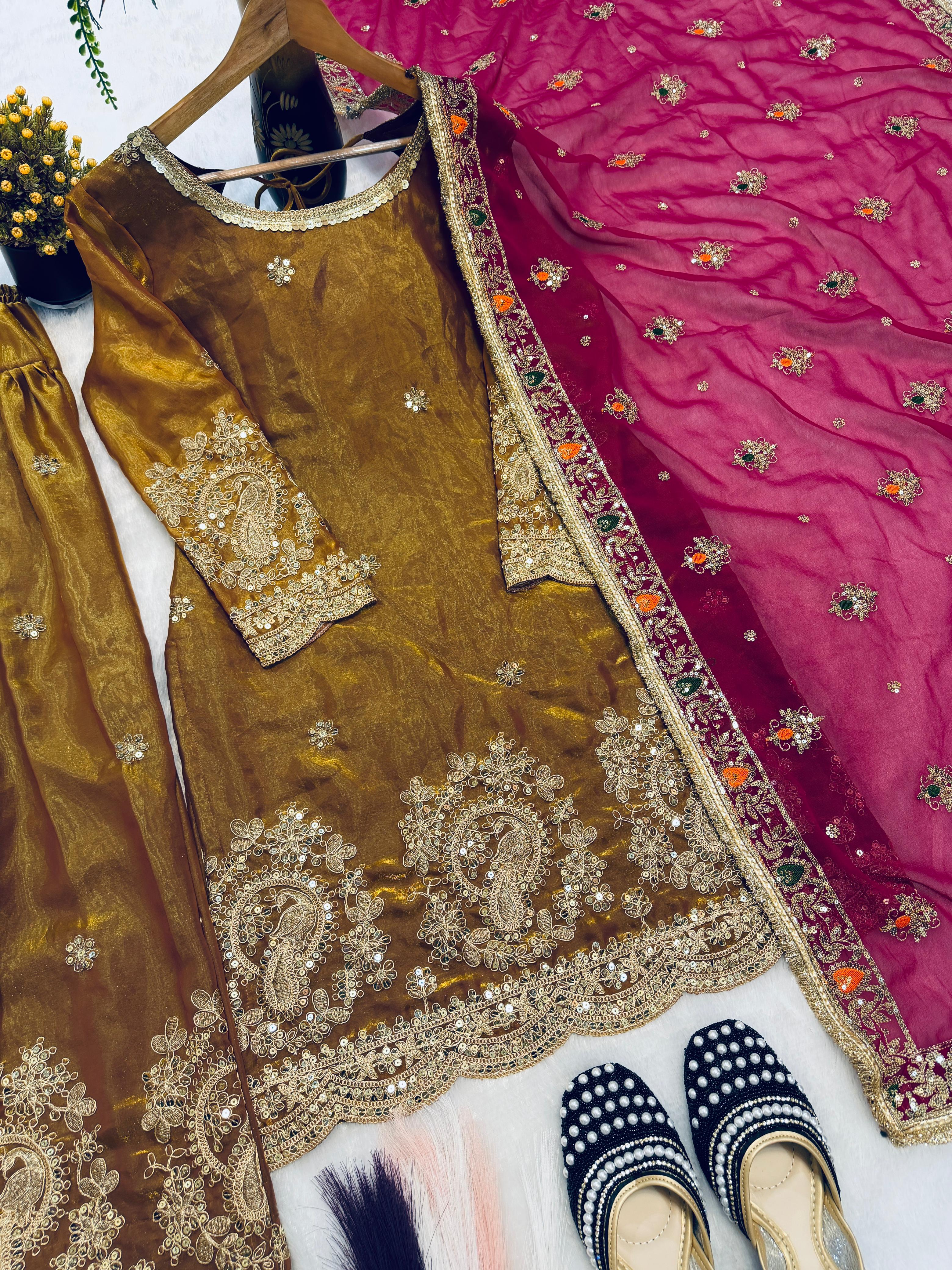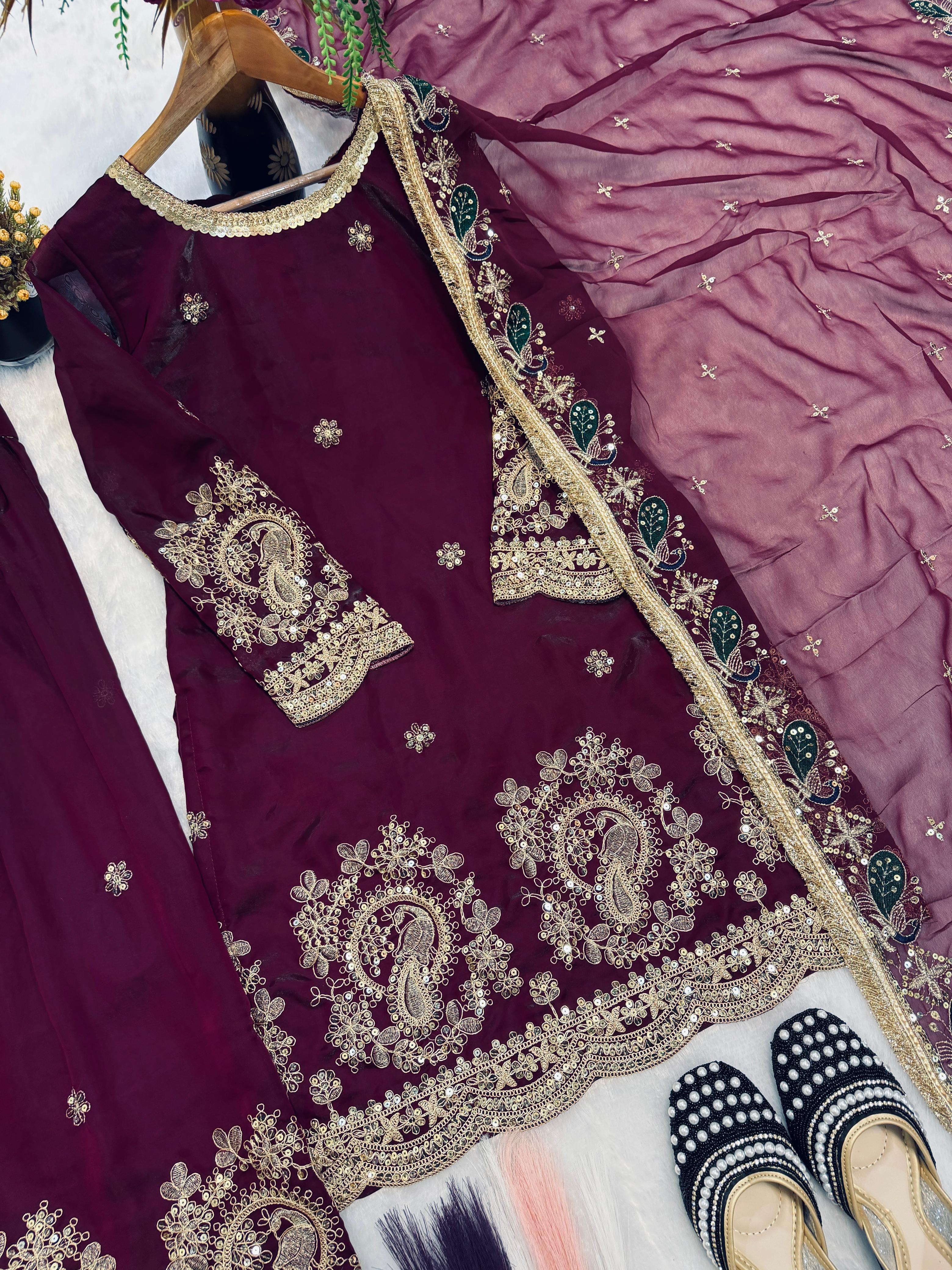 *Farshi salwar Fabric*: Heavy Fandy Crushi Silk Embroidery thread work Sequence Work.