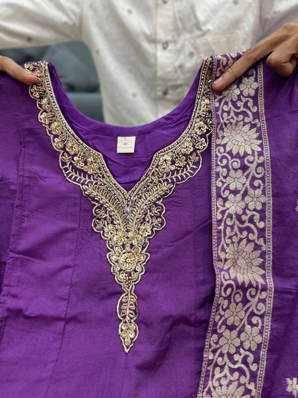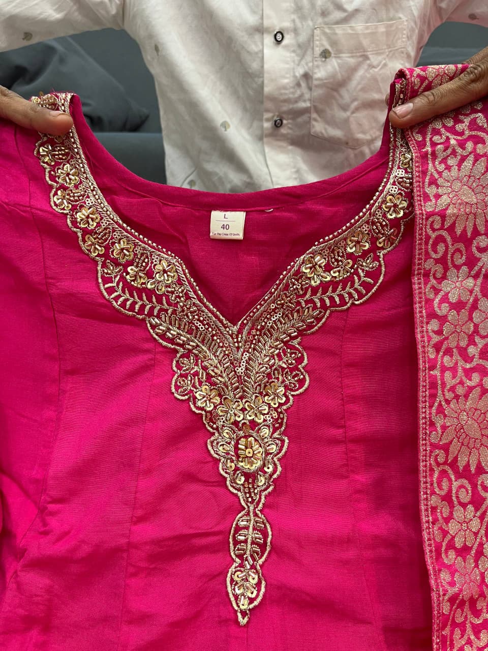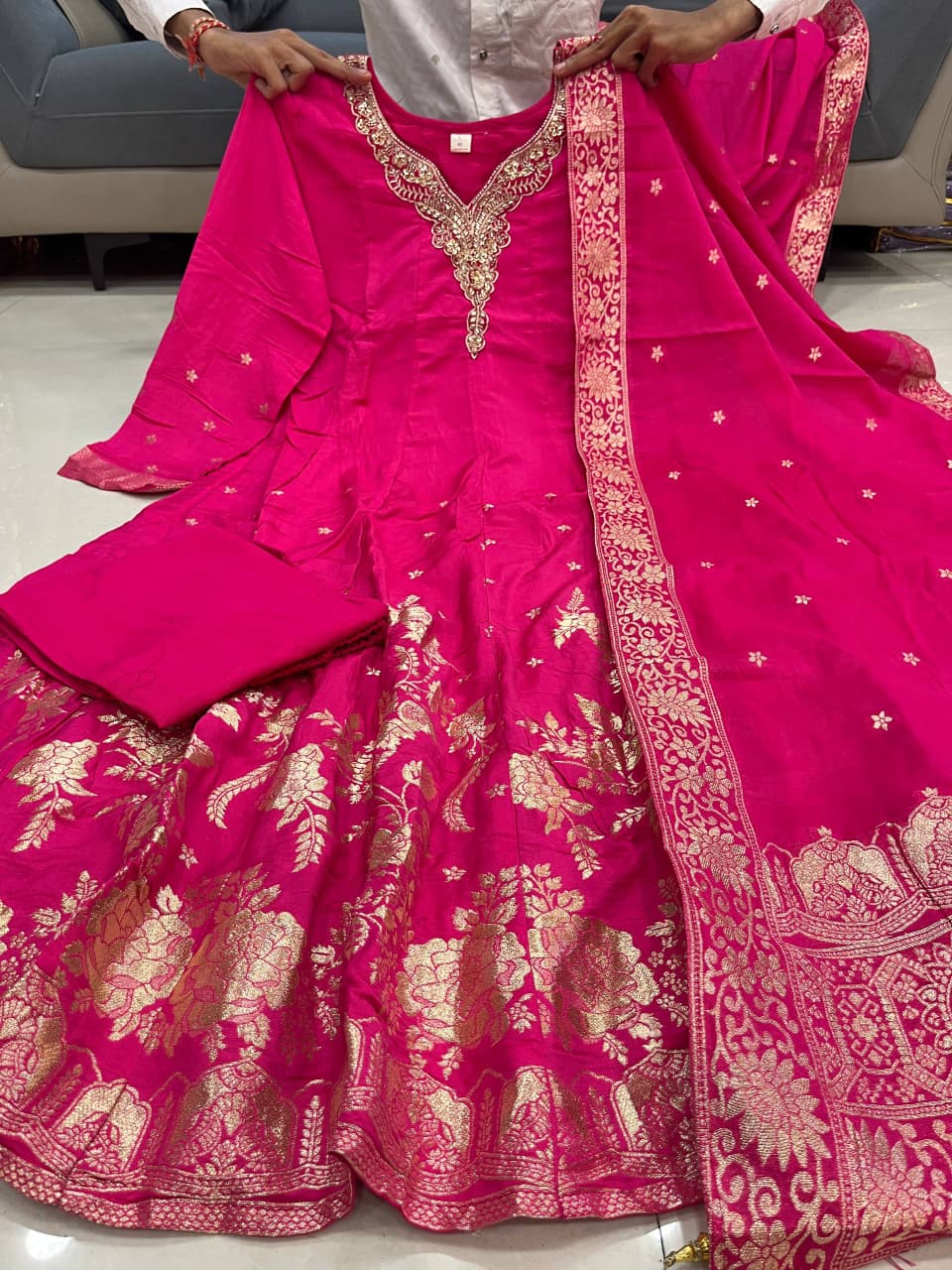 *Elegance that speaks without words! A premium Anarkali style outfit crafted on chanderi base fabric with beautiful hand-worked neckline & Banarasi zari weaving detailing on the flare and dupatta. Perfect choice for wedding, party & festive functions. Elegance that speaks without words! A premium Anarkali style outfit crafted on chanderi base fabric with beautiful hand-worked neckline & Banarasi zari weaving detailing on the flare and dupatta. Perfect choice for wedding, party & festive functions.*