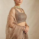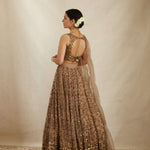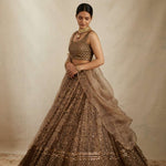 Elevate your ethnic wardrobe with this stunning Brown Net Lehenga Set, beautifully crafted with intricate 3mm & 5mm sequins and zari embroidery work.