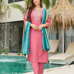 Women's Viscose Silk Embroidered Straight Kurta with Pant And Dupatta Sets