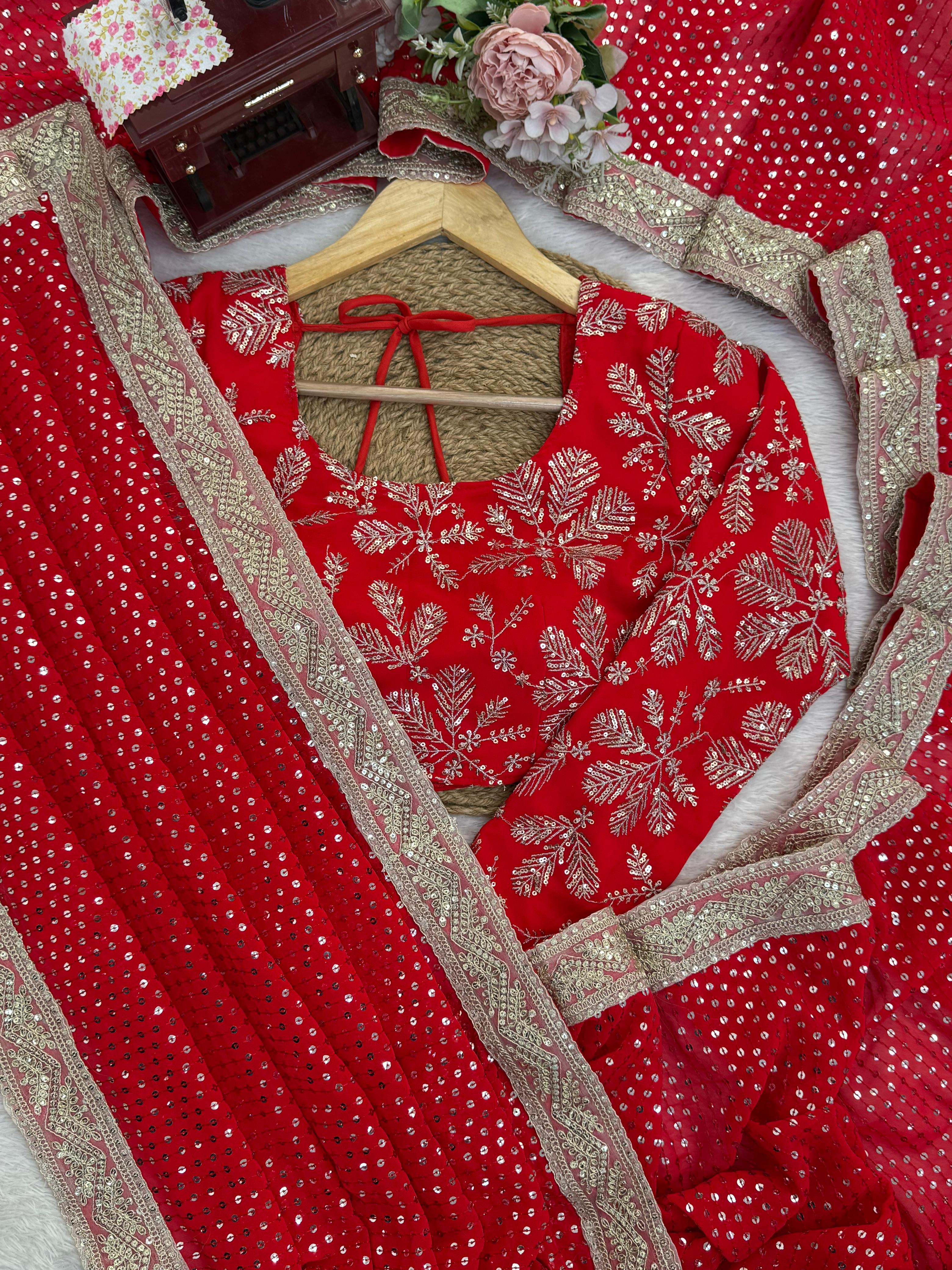 Fall in love with this stunning saree in an eye-catching shade, crafted with finesse and rich detailing. A perfect blend of grace and glam!