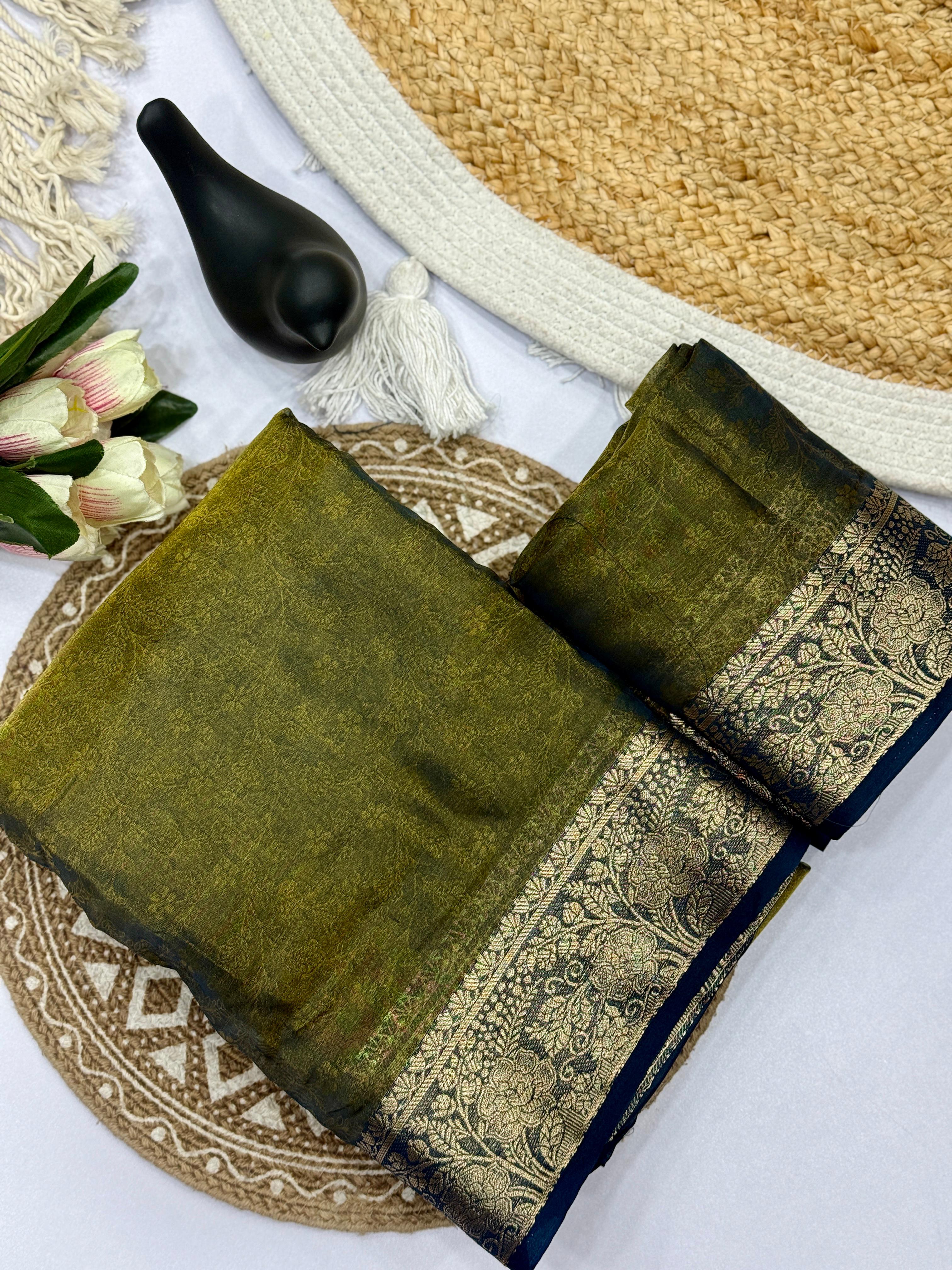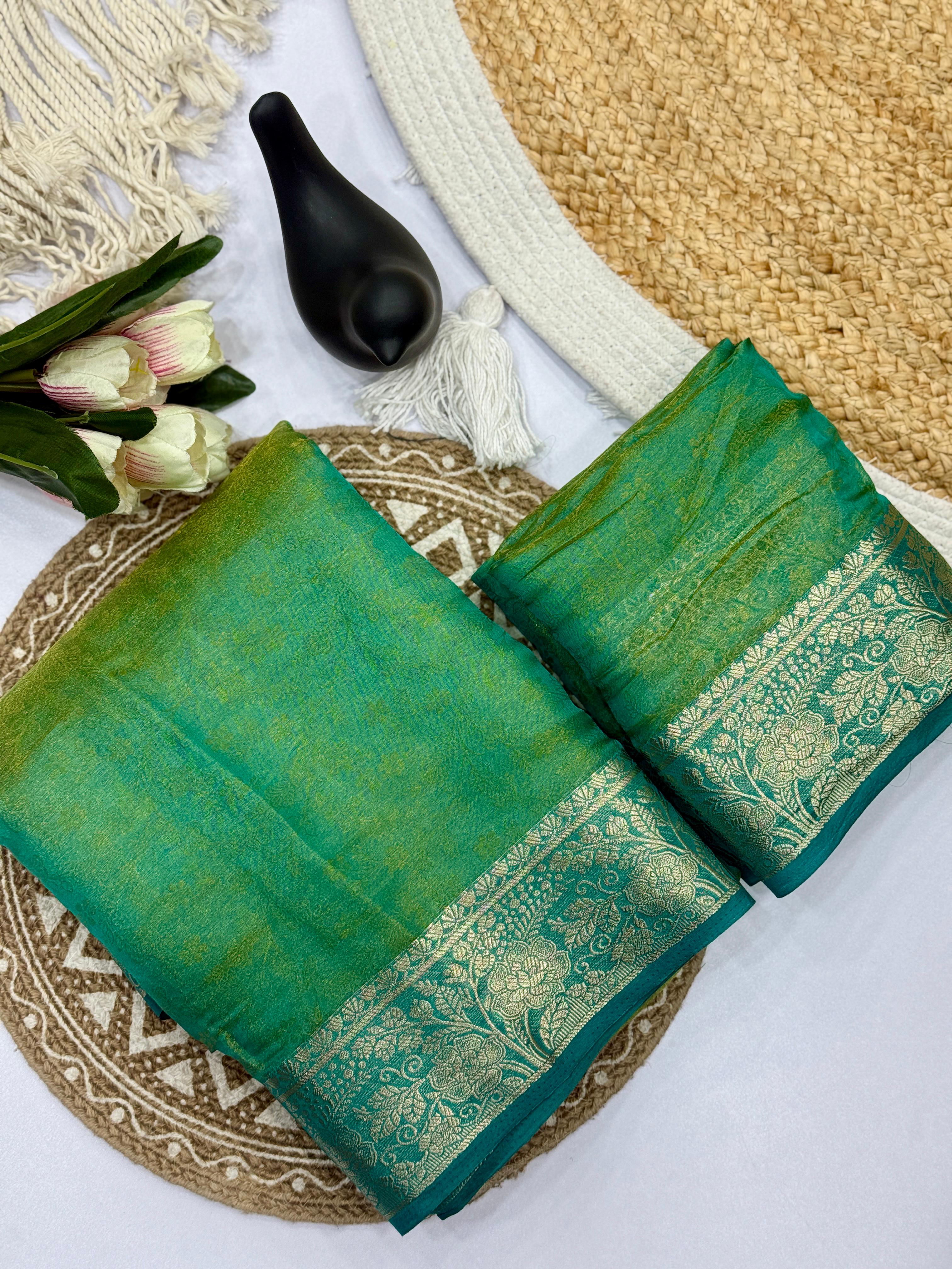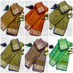 RICH EYEWEAR COOL COLOR RANGE SOFT SHINE SPACE SILK FABRICS ALONG WITH ZARI BORDER WEAVING WITH RICH ZARI PALLU WITH RUNNING BLOUSE